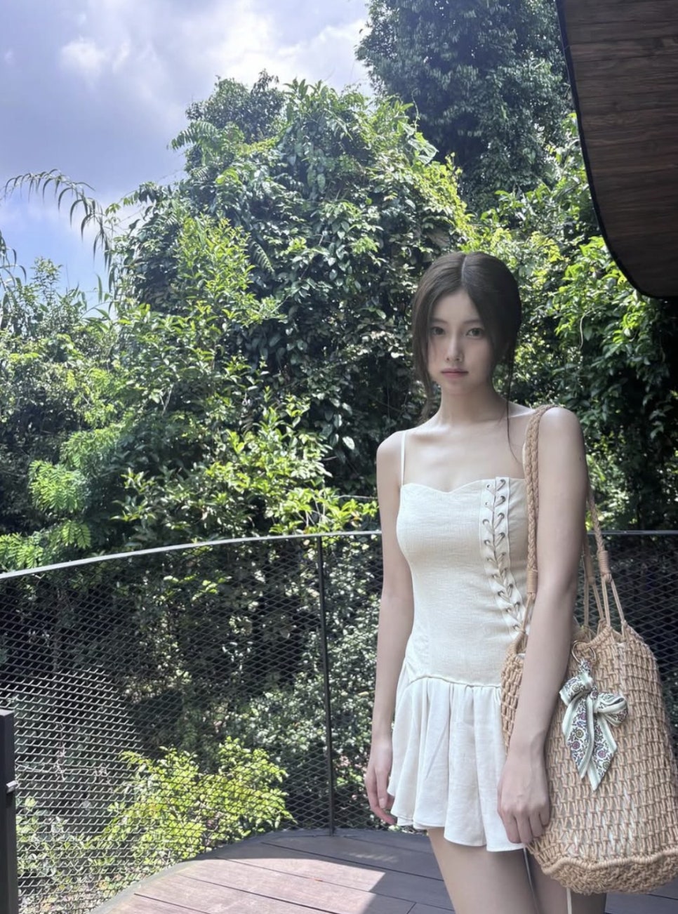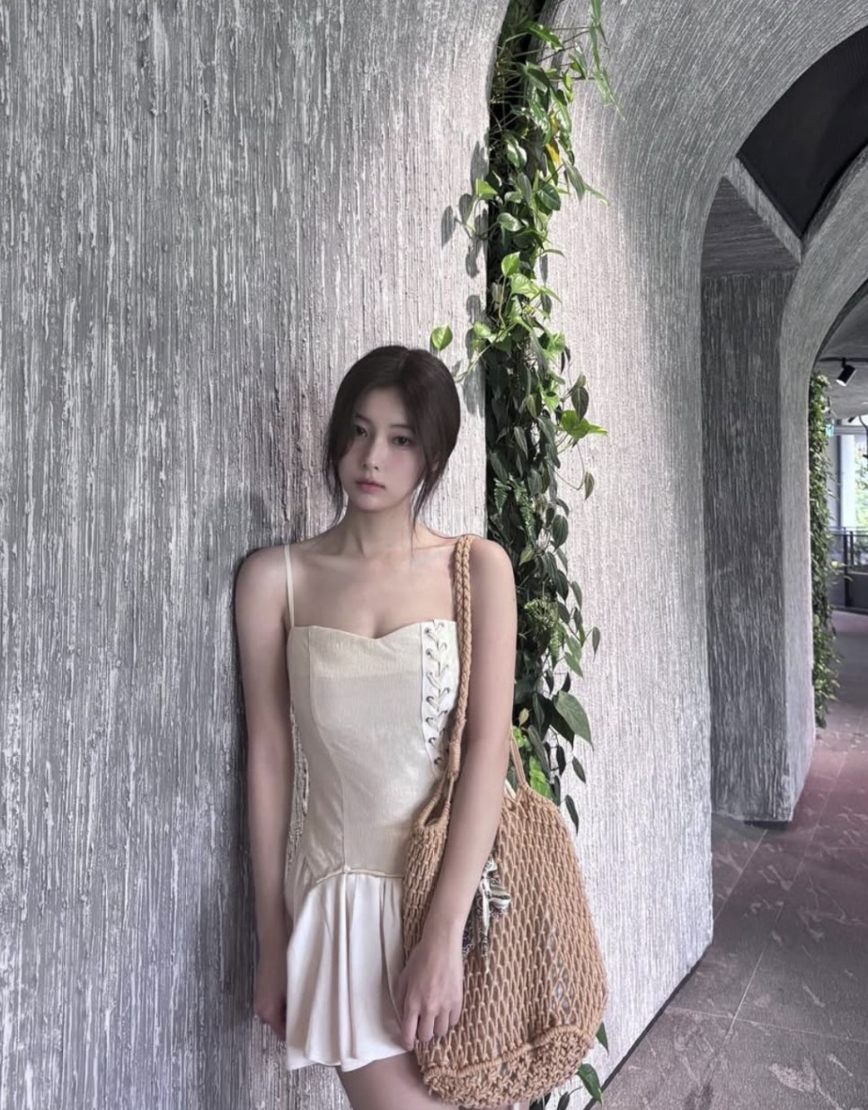 ​강혜원은 이 원피스를 단독으로 착용하며 담백하고도 자연스러운 분위기를 살렸습니다. 내추럴하게 묶은 헤어스타일과 은은한 베이스 메이크업, 그리고 리본이 달린 그물 디자인의 백을 매치해 전체적인 무드를 더욱 여유롭고 산뜻하게 표현했어요!