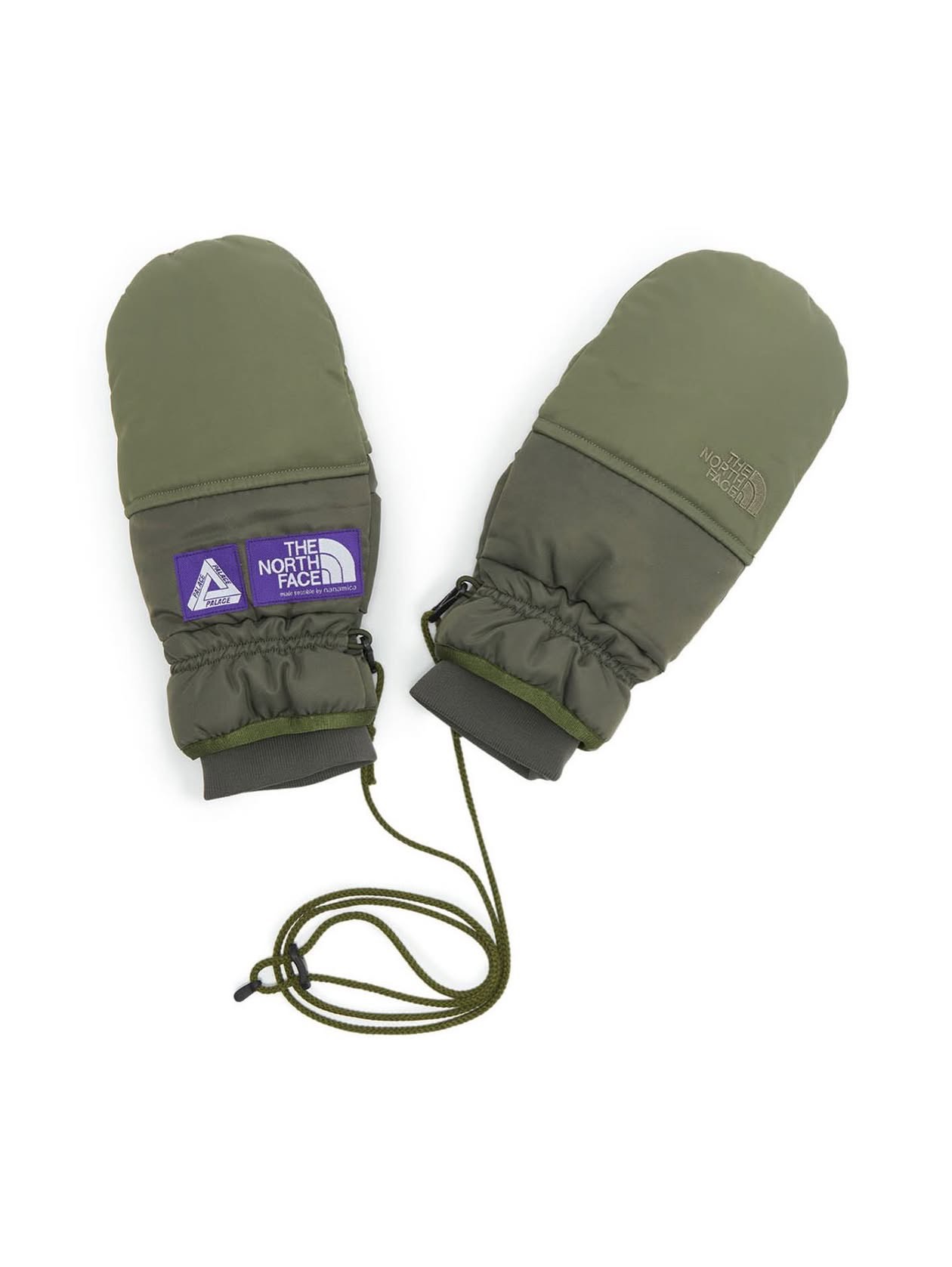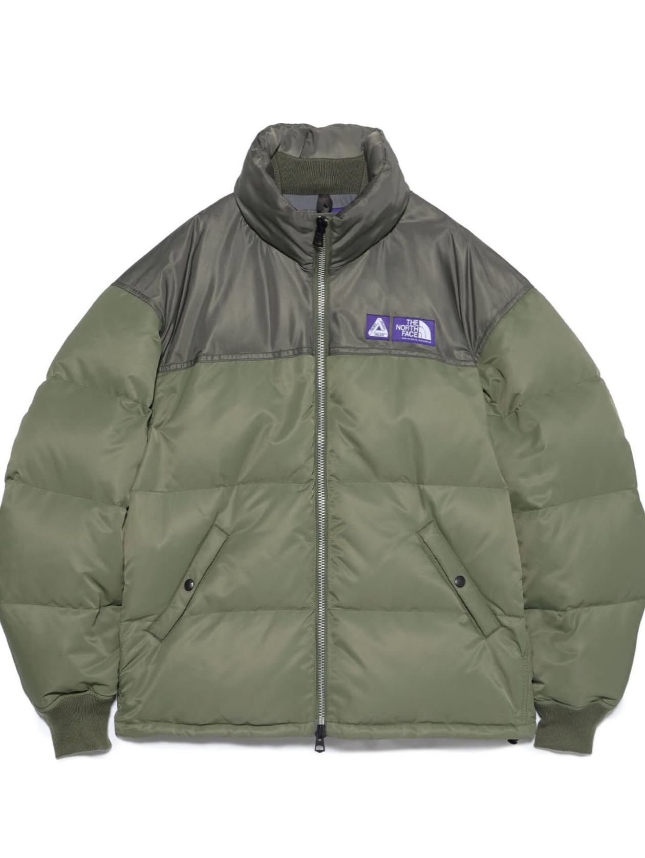 ・왼쪽에는 THE NORTH FACE Purple Label 브랜드 라벨과 PALACE SKATEBOARDS를 나타내는 Tri-Ferg 브랜드 라벨 부착