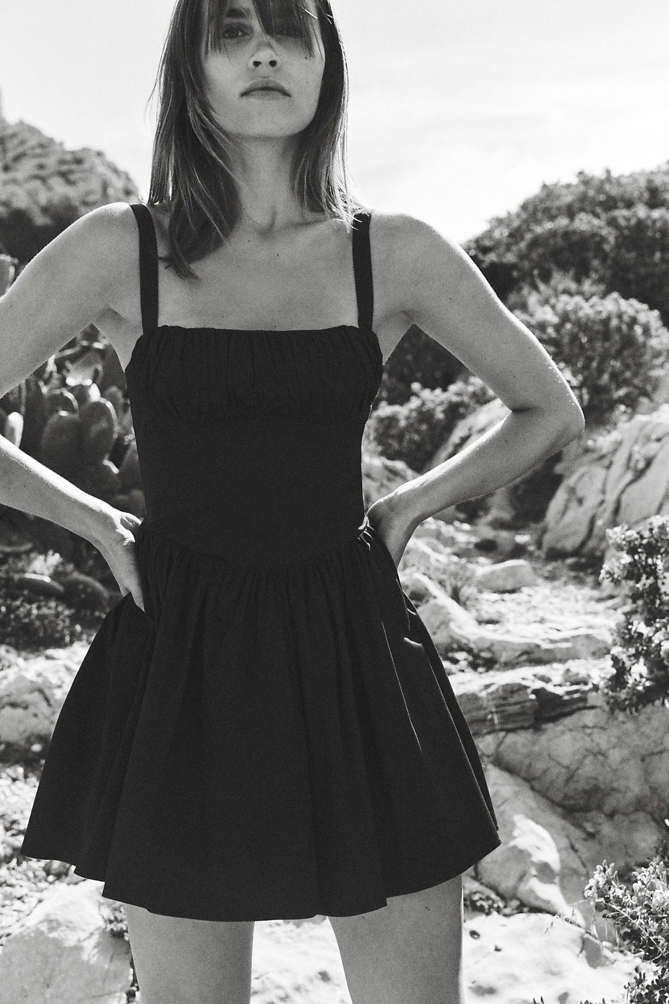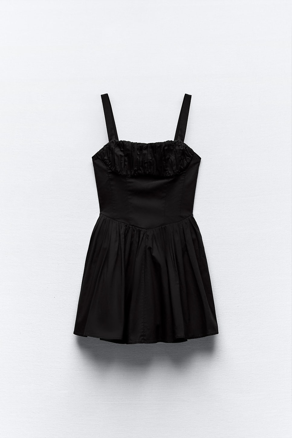 일자 네크라인과 스트랩이 달린 원피스인데요. 가슴과 허리 부분에 주름이 있어 원피스 이름처럼 한층 볼륨감있는 아웃핏을 연출해주는 제품이라고 할 수 있어요!