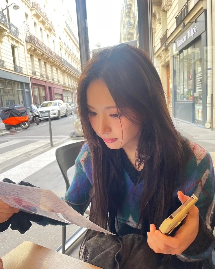 신세경은 여행 중 블루와 그린, 그레이 등 차분한 톤이 어우러진 아가일 크롭트 스웨터를 입었어요. 사실 스웨터 하나만 놓고 봐도 가을 분위기를 물씬 풍기는 컬러들의 조합이죠!