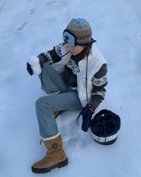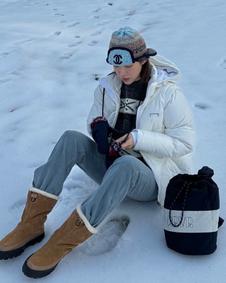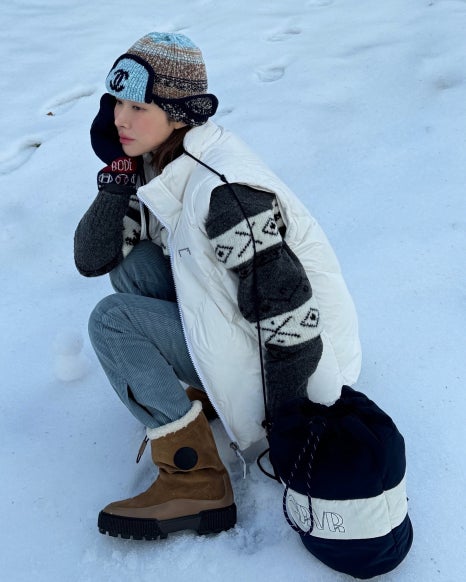 쓱 보기만 해도 겨울 무드가 물씬 느껴지는 아이템을 착용한 채 말이죠! 차정원은 노르딕 패턴 스웨터에 발목까지 올라오는 따스한 어그부츠 그리고 샤넬 보닛 햇과 장갑을 매치했습니다. 그녀가 착용한 아이템 하나하나가 너무 독특하고 예쁘지만 그 중 벙어리 모양의 겨울 장갑이 시선을 끄는데요. 스키장에서도 눈 놀이 시에도 유용하게 활용할 수 있는 겨울 장갑을 찾는다면 주목해 보세요!
