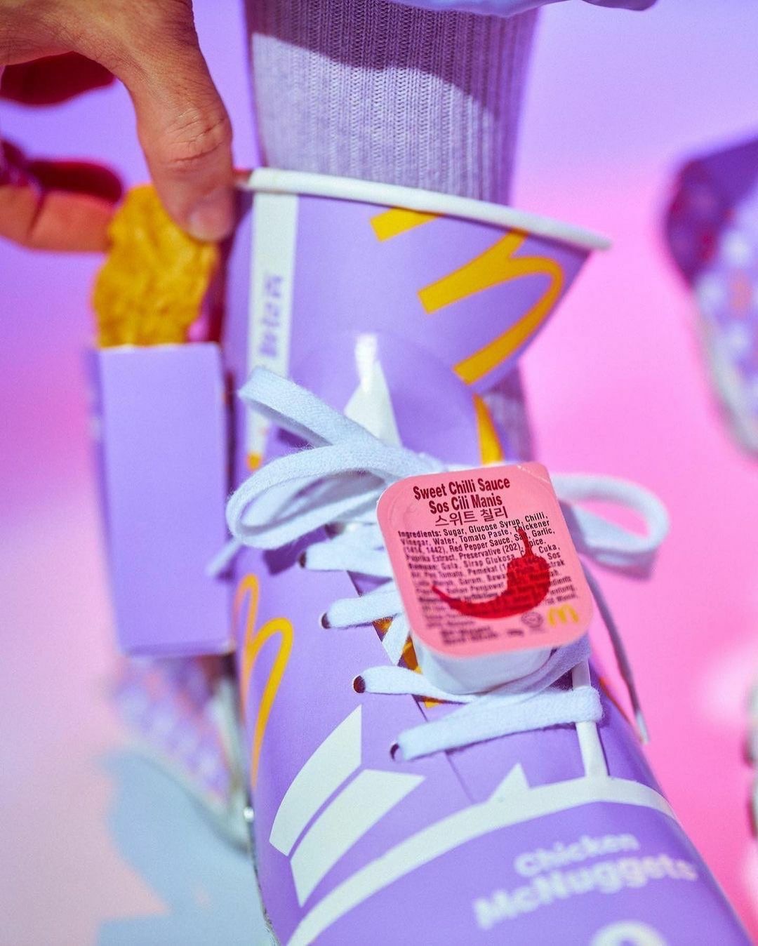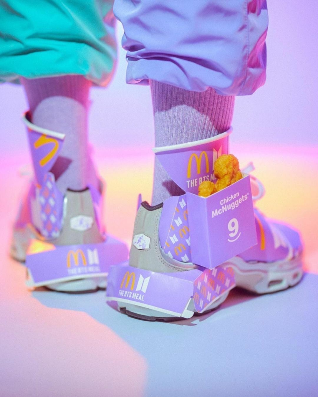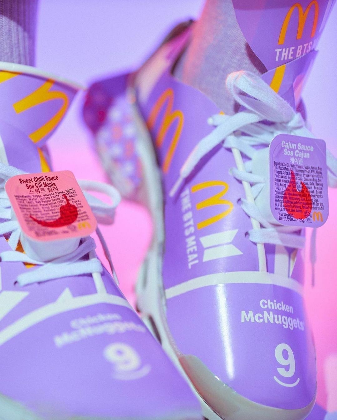 josiahchua 가 커스텀 작업했다는 나이키 에어맥스 플러스는 BTS 를 상징하는 보랏빛이 가득한데, 최근 출시된 맥도날드 BTS meal 과 제법 잘 어울린다. 에어맥스 어퍼에는 맥도날드 방탄소년단 세트 메뉴에 등장하는 아이템인 스위트 칠리 케이준 소스와 맥너겟이 부착되어 있고, 겉은 뭘로 꾸민거지? 싶었던 겉 커버는 후렌치후라이 박스와 맥너겟 케이스가 고루 사용된 것으로 추측되네...