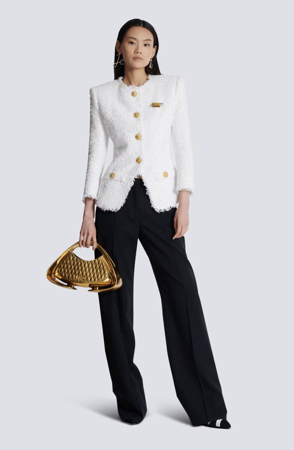 김유정이 착용한 자켓은 발망 트위드 자켓 ‘Fitted tweed jacket’입니다. 오돌토돌한 텍스쳐가 살아있는 순백색의 트위드 자켓이죠. 중앙과 포켓, 소매에 들어간 화려한 금 메탈 단추는 룩의 포인트와 고급스러운 분위기를 살려주고 있습니다. 어깨에 들어간 각은 포멀하면서도 세련된 분위기를 내고 있네요.