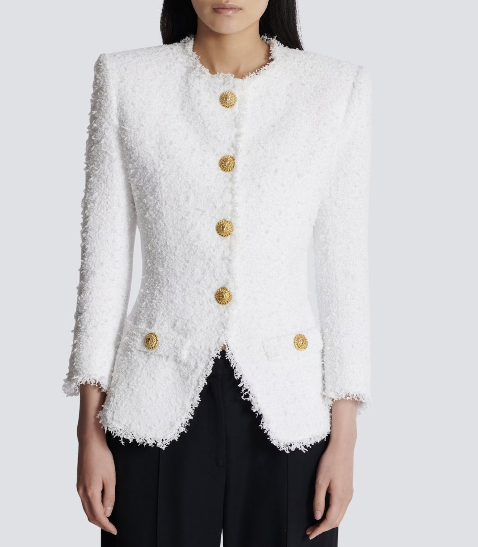 김유정이 착용한 자켓은 발망 트위드 자켓 ‘Fitted tweed jacket’입니다. 오돌토돌한 텍스쳐가 살아있는 순백색의 트위드 자켓이죠. 중앙과 포켓, 소매에 들어간 화려한 금 메탈 단추는 룩의 포인트와 고급스러운 분위기를 살려주고 있습니다. 어깨에 들어간 각은 포멀하면서도 세련된 분위기를 내고 있네요.