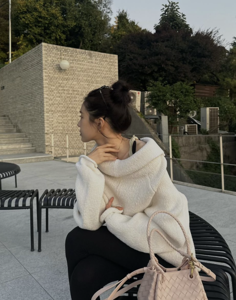 손나은이 착용한 제품은 보테가베네타의 ‘컴팩트 코튼 하이 넥 점퍼’입니다. 압축된 면 소재의 두툼한 니트로 목 부분이 높게 올라가 있는 하이넥 디자인이 특징인 제품이죠.