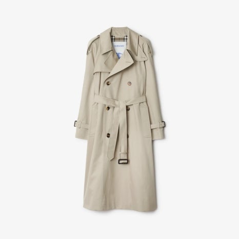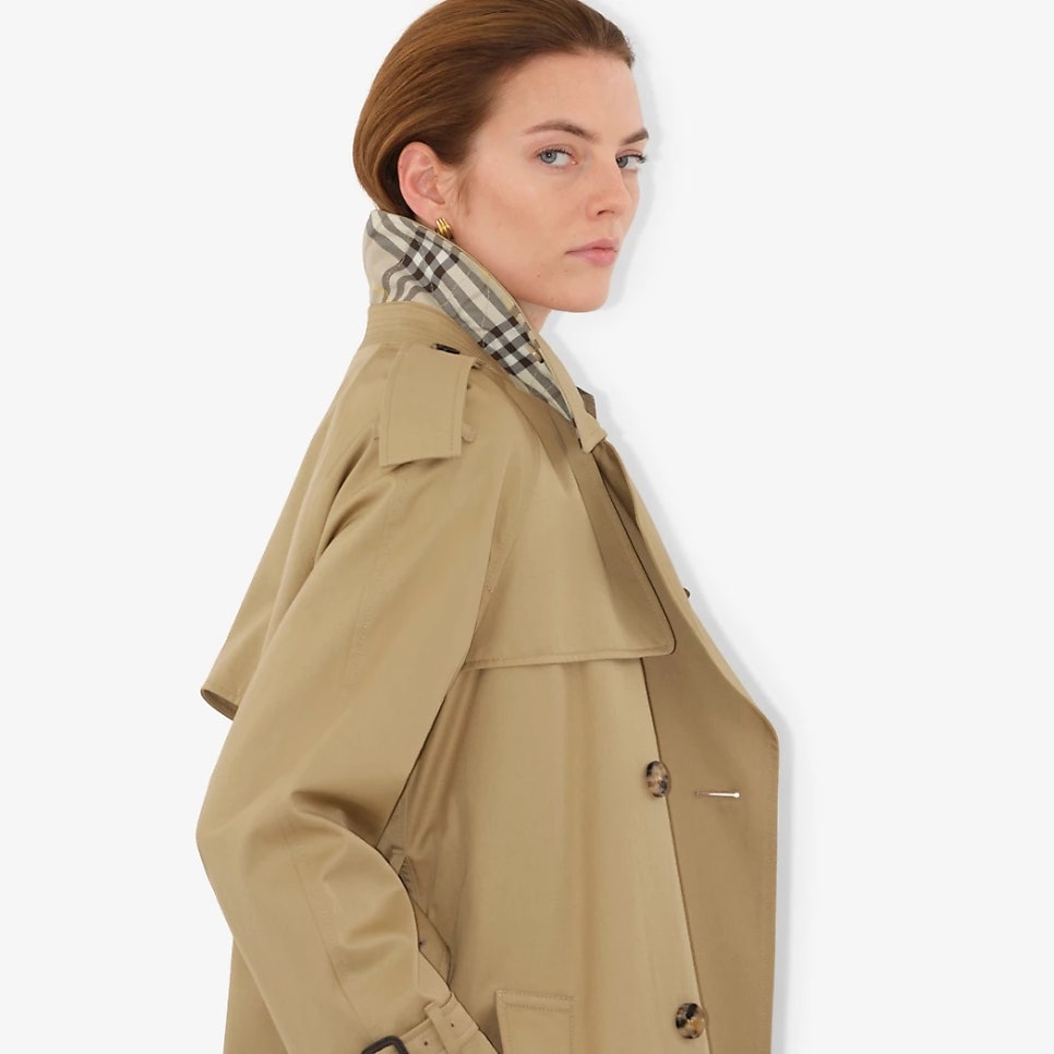 버버리답게 영국에서 제작된 트렌치코트로 버버리의 시그너처 마크인 체크 안감이 돋보이는 제품입니다. 생활 방수가 가능한 면 개버딘 소재로 제작되어 트렌치코트답게 방수 기능을 탑재했습니다.