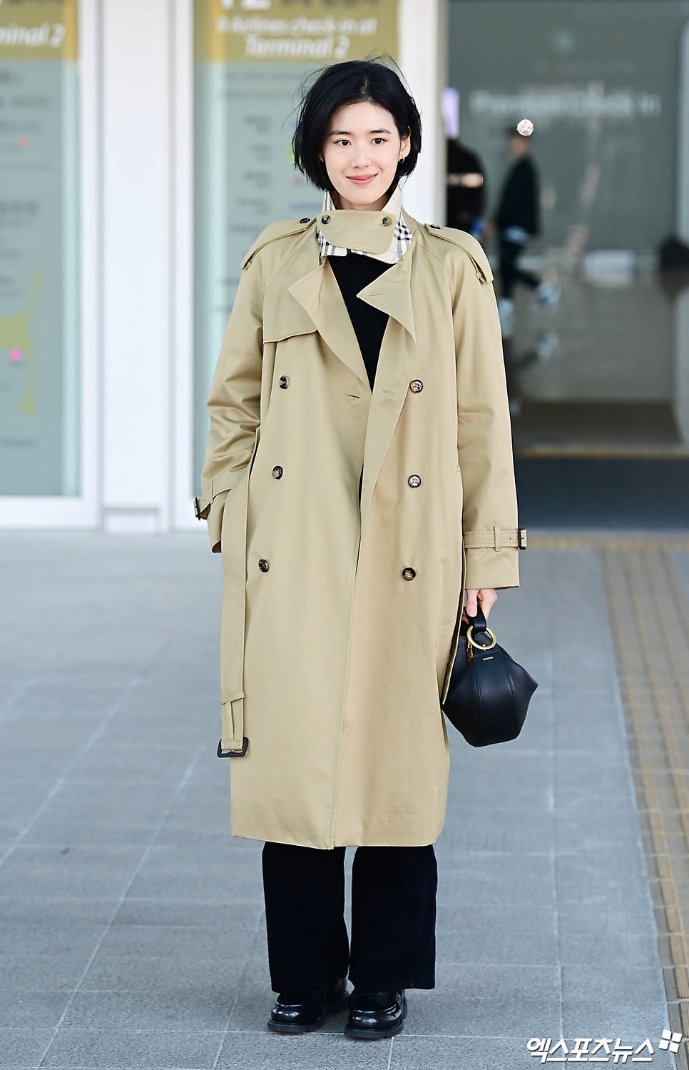 정은채는 겨울에서 봄으로 넘어가는 지금과 같은 3월에 딱 입기 좋은 트렌치코트를 입은 채 멋스럽고 세련된 공항 패션을 선보였는데요. 무릎까지 길게 내려오는 트렌치 코트에 블랙 이너와 낮은 굽의 로퍼를 착용해 우아하면서도 포멀한 아웃핏을 연출했어요~~~ 귀 밑까지 짧게 자른 그녀의 커트 머리와 버버리의 트렌치코트의 조화가 너무 좋은데요!