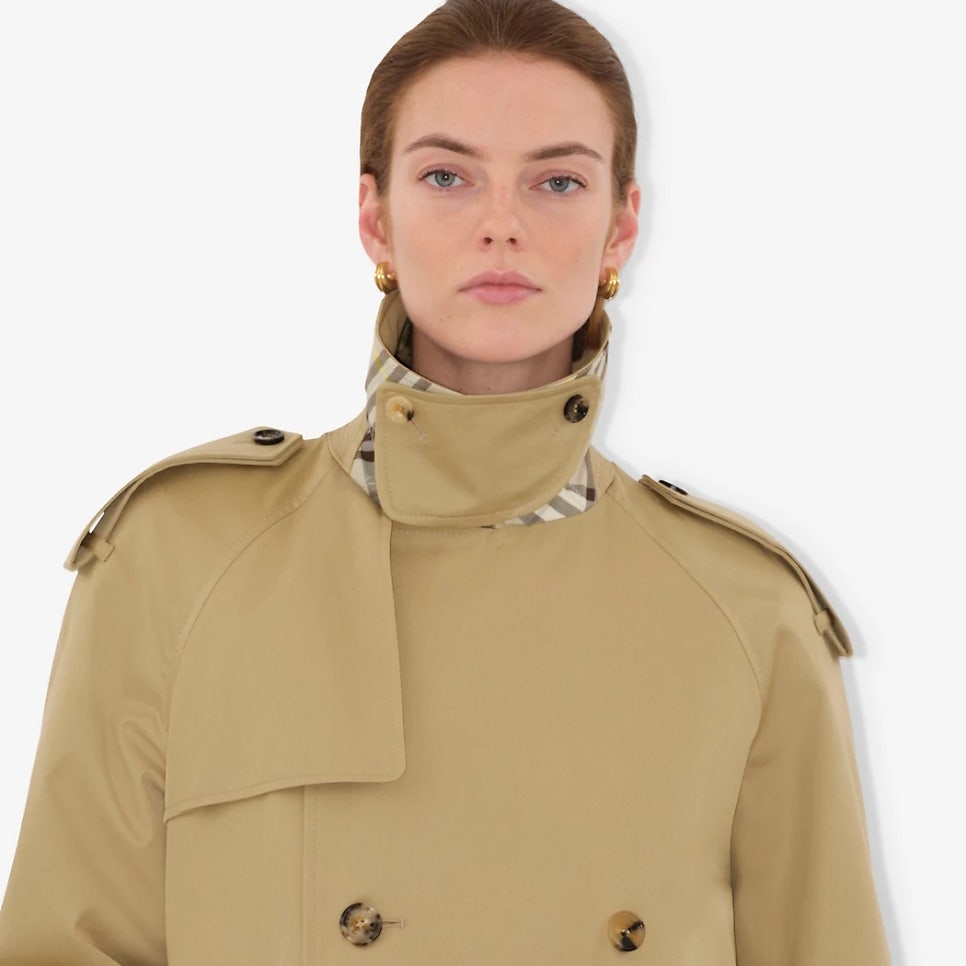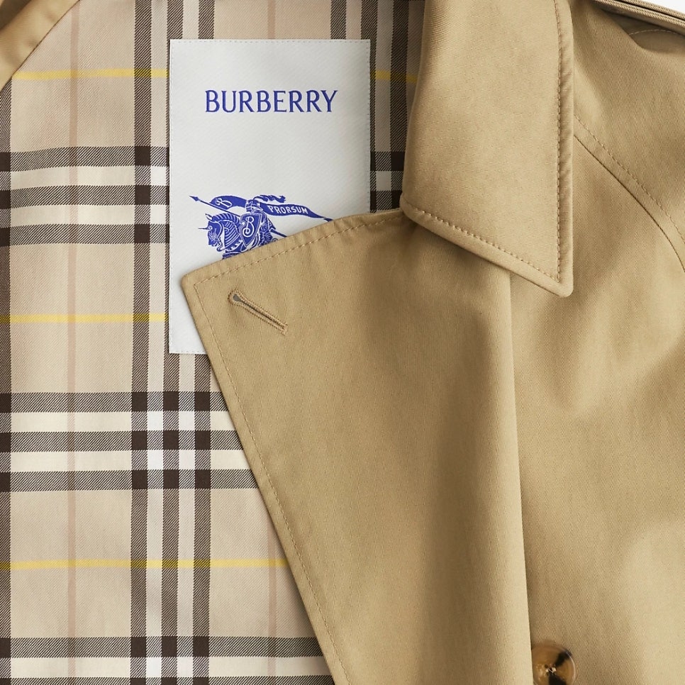 버버리답게 영국에서 제작된 트렌치코트로 버버리의 시그너처 마크인 체크 안감이 돋보이는 제품입니다. 생활 방수가 가능한 면 개버딘 소재로 제작되어 트렌치코트답게 방수 기능을 탑재했습니다.