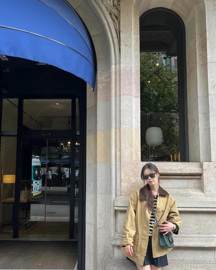 스페인 여행 중이었던 고아라는 컬러 배색의 클래식한 워크 재킷 디자인을 착용했어요. 베이지 컬러에서 빈티지한 무드도 느껴집니다. 여유로운 핏 덕분에 옷을 여러 겹 레이어드할 수 있어 실용적이기도 해요. 고아라는 스트라이프 가디건과 블랙 플리츠 미니스커트로 미니멀하면서도 발랄한 룩을 연출했어요.
