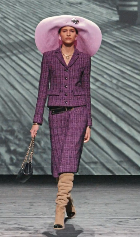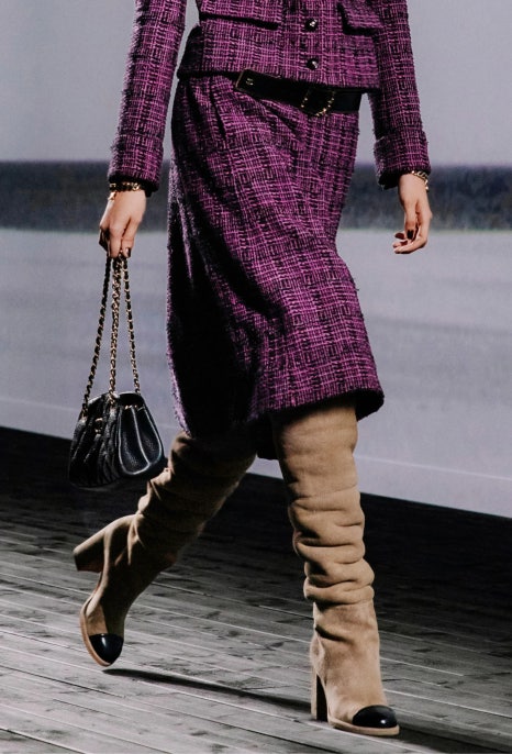 샤넬을 대표하는 패턴, 트위드가 들어가 있는 미디 기장의 스커트입니다. 비교적 일자로 떨어지지만 중앙에 들어가 있는 주름으로 걸을 때 불편하지 않을 넉넉한 폭을 연출해 주죠. 또한 무릎까지 덮는 기장으로 롱부츠와 매치한다면 한겨울 추위에도 끄떡없는 룩이 가능합니다.
