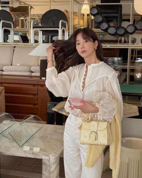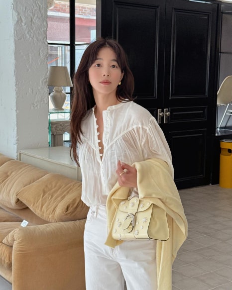 본격적인 봄을 맞이하는 요즘, 사랑하는 사람들 혹은 친구들과 봄나들이를 계획하는 분들이 많이 보이는데요. 점점 더워지는 요즘 나들이룩을 찾고 있다면 기은세의 오오티디를 참고해 보세요. 기은세는 속이 은은하게 비치는 시스루 블라우스에 화이트 팬츠 그리고 봄 느낌이 낭낭한 델보 신상백을 매치해 포인트를 주었습니다.