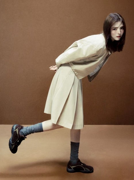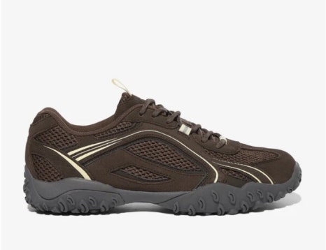그녀가 착용한 운동화는 휠라의 ‘에샤페 초코’입니다. 1995년에 출시된 TERRAIN CRUSHER 제품을 현대적으로 재해석한 모델이죠. 브라운 색을 바탕으로 아이보리 색의 스포티한 라인이 포인트로 들어가 있는 해당 제품은 꾸준히 유행하고 있는 고프 코어의 감성을 살리고 있어 트렌디함을 놓치지 않고 있는 모습입니다.