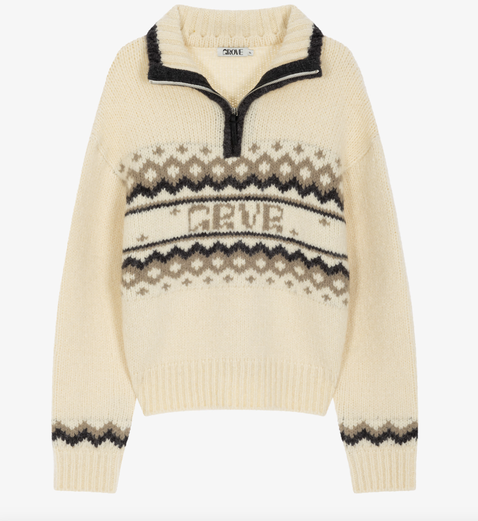 클래식한 노르딕 패턴의 하이넥 하프집업 디자인의 이 니트는 알파카 혼방 원사로 높은 보온성과 부드러운 착용감이 특징이라고 해요. 하이넥 디테일로 한겨울철에도 따뜻하게 몸을 감싸주며 지퍼 부분 가죽 플러 디테일로 포인트를 준 제품이라고 하네요! 소버 니트처럼 따뜻한 감성의 니트여서 추천드려요.