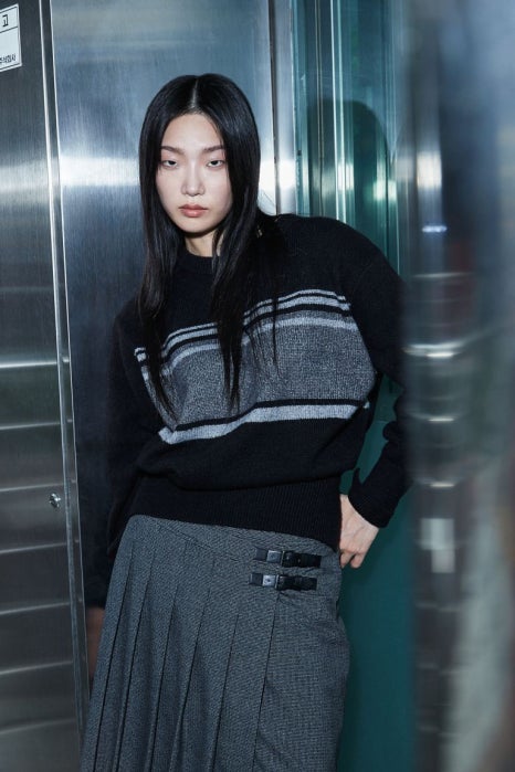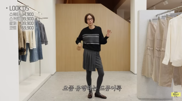 올 가을 빼놓을 수 없는 드뮤어룩을 김나영은 밑단에 버튼 디테일이 있는 스웨터와 다크 그레이 컬러의 플리츠 랩 스커트로 입어보았는데요. 톤온톤 상하의와 그레이 타이즈까지 무채색으로 색감을 맞춰주고 안경을 써주어 드뮤어스러운 느낌을 더욱 살려주었습니다. 드뮤어룩은 시도해보고 싶은데 너무 비싼 옷을 마련하기에는 부담이신 분들은, H&M의 가성비 옷으로 시도해보시면 좋을 것 같네요!