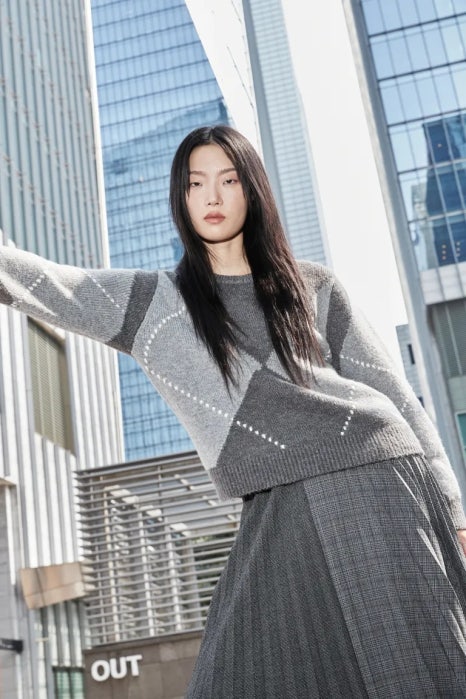 먼저 김나영은 기본적인 아가일 패턴이 들어있는 니트에 비대칭 길이로 유니크함을 더한 어시메트릭 플리츠 스커트를 매치해 깔끔하지만 포인트 있는 룩을 선보였습니다.