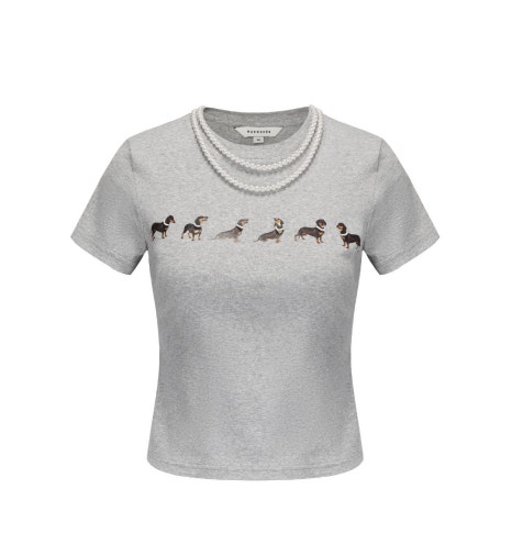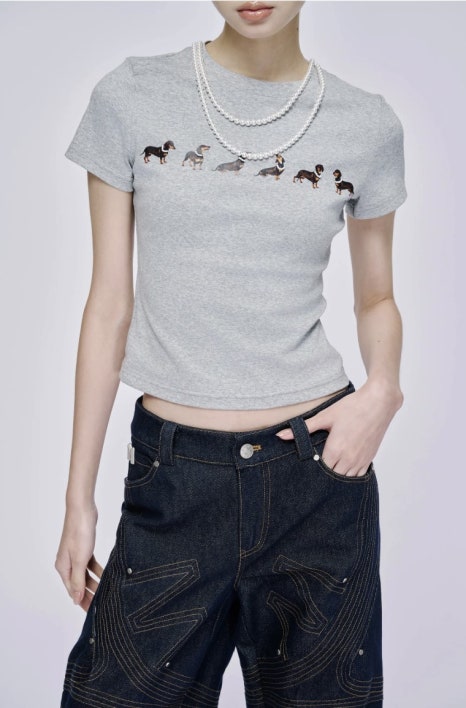 제니가 챌린지에서 착용한 기본 티셔츠, 마크공 스튜디오의 ‘Dog Print Jersey T-shirt’입니다. 중앙에 가로로 배치되어 있는 강아지 프린트가 귀여운 포인트인 아이템이죠. 넥 부분에 더해진 진주 체인은 여성스럽고 시크한 느낌을 더해주고 있어요.
