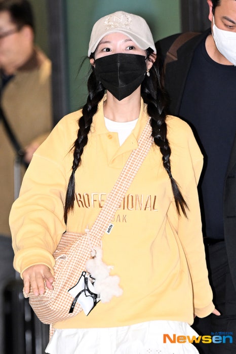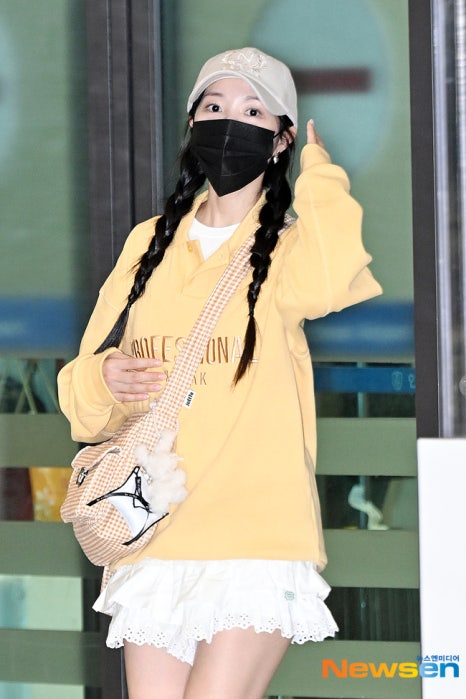 김혜윤은 옐로우와 화이트로 컬러를 맞춰 한층 화사한 공항 룩을 선보였는데요. 옐로우 컬러 맨투맨에 펀칭 디테일이 돋보이는 스커트에 볼캡과 크로스백을 매치했습니다. 여기 길게 땋은 양갈래 머리개 그녀의 사랑스러움을 더욱 배가 시켜주는 것 같은데요. 이 날 김혜윤이 착용한 옐로우 컬러 맨투맨은 코닥 어패럴에서 출시한 와플 맨투맨입니다.