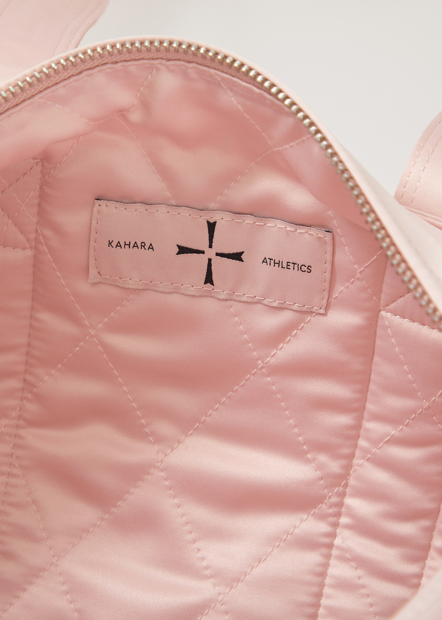 라운드 형태의 더플 백 부드럽고 광택나는 소재 패디드 안감 디테일 여닫이가 용이한 마그넷 디테일 광택나는 실버 로고 디테일 블러쉬 핑크 컬러