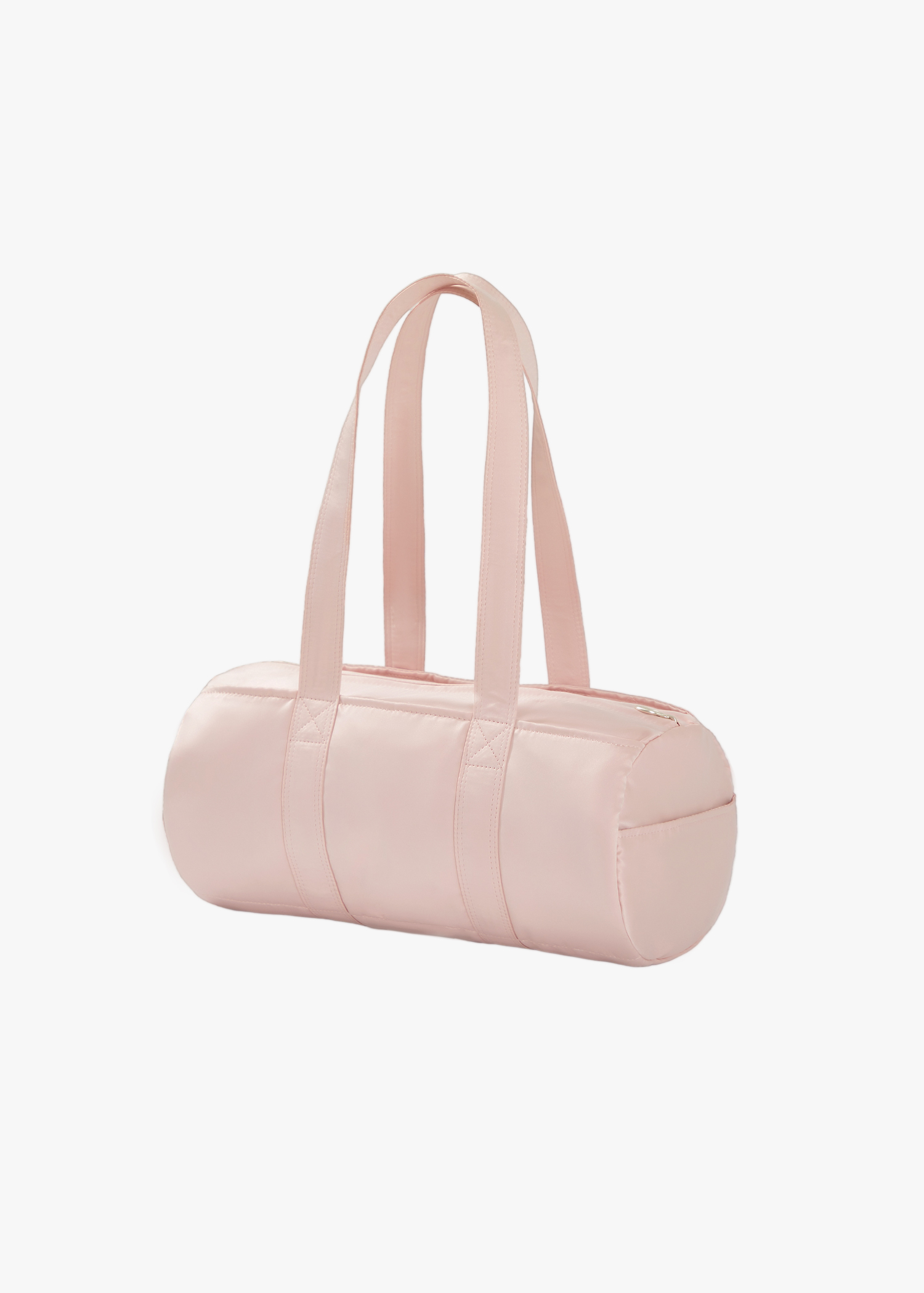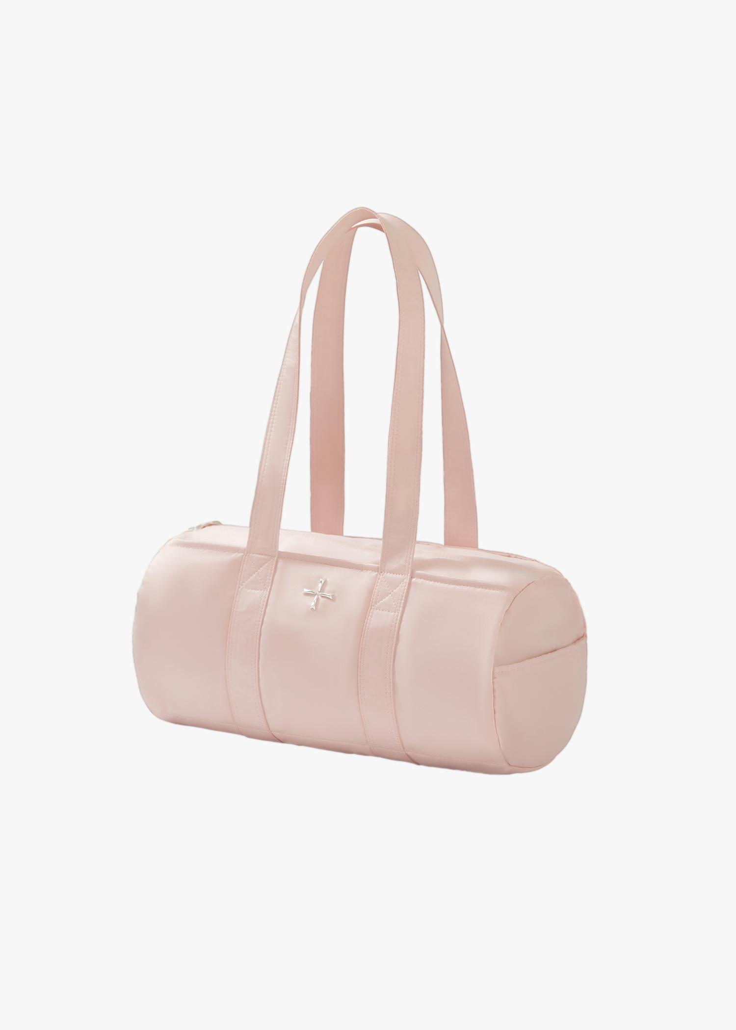 라운드 형태의 더플 백 부드럽고 광택나는 소재 패디드 안감 디테일 여닫이가 용이한 마그넷 디테일 광택나는 실버 로고 디테일 블러쉬 핑크 컬러