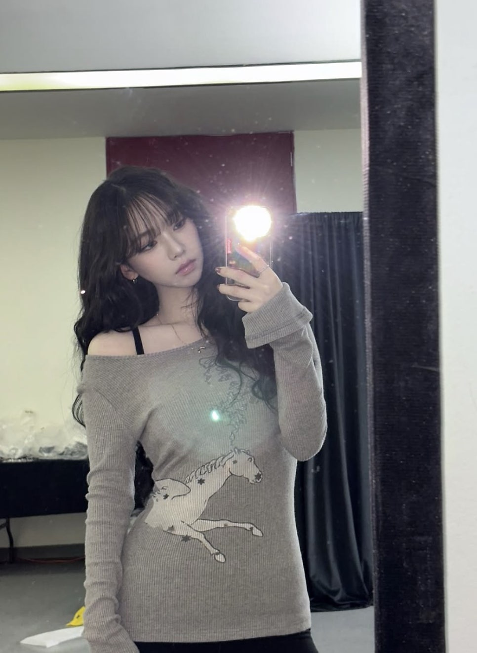 중앙에 들어간 말 프린팅은 빈티지한 느낌을, 길게 떨어기는 총장 및 소매는 여리여리한 분위기를 더해주고 있는데요! 기존 아이템은 오프숄더로 디자인되지 않았지만 카리나는 넥 라인을 확장해 오프숄더로 연출한 모습입니다. 여성스러운 분위기와 눈에 띄는 포인트를 잡은 센스 있는 방법이라고 할 수 있죠.