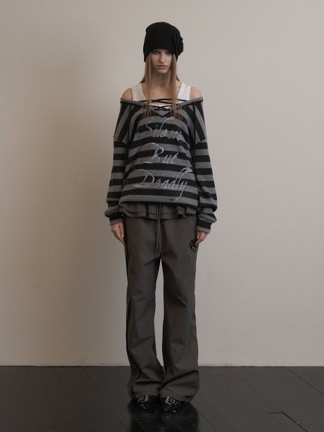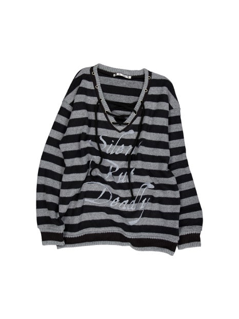 깊게 파인 V자형 넥 라인과 그 위에 달린 아일렛 및 스트링 포인트는 흔히 볼 수 없는 유니크 빈티지한 느낌을 더해주고 있죠. 넓은 간격의 검흰 스트라이프와 레터링으로 완성된 전체적인 옷의 분위기는 고스 펑크, 빈티지 룩 등 다양한 분위기를 연출할 수 있을 것으로 보입니다.
