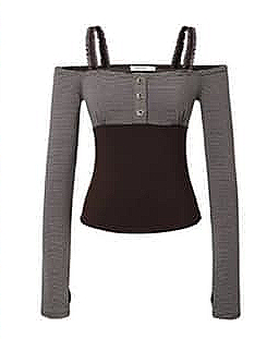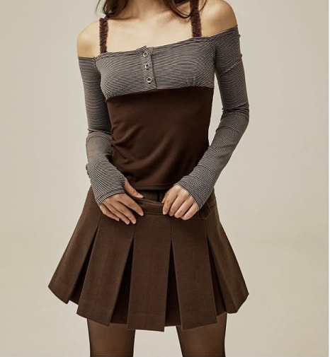 여성스러움에 귀여움이 한 스푼 더해진 해당 제품은 쓰리 타임즈의 ‘Pipi Stripe off top’입니다. 크게 스트라이프 패턴의 윗부분과 어두운 갈색의 하단 부분으로 나누어지는 디자인이죠. 양쪽 어깨에 들어간 스트링 포인트와 중앙에 들어간 세 개의 단추는 해당 아이템의 귀여운 면모를 더욱 강조해 주고 있기도 합니다.