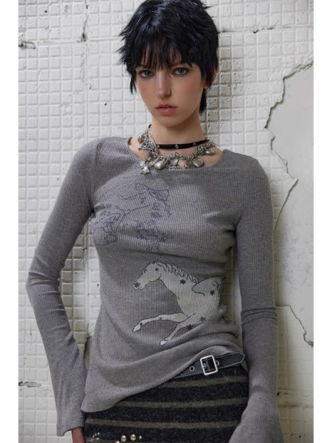 [G0065]Pony Printed Round-neck Long-sleeved T-shirt