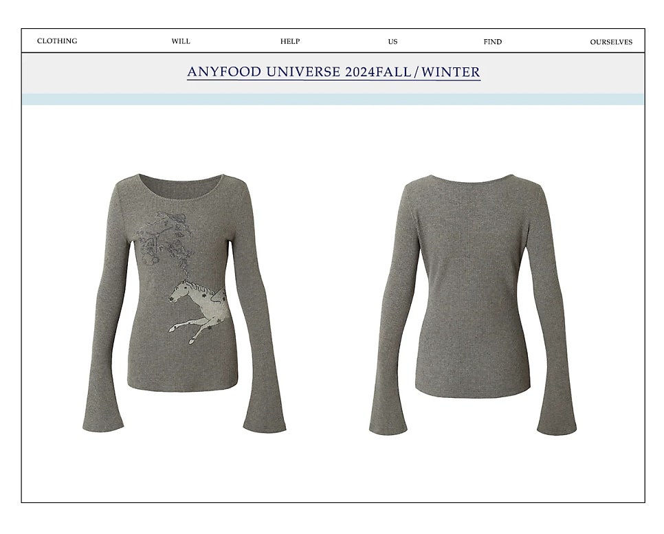 에디터 개인적으로 가장 눈길이 갔던 세 번째 아이템은 애니푸드유니버스의 ‘Pony Printed Round-neck Long-sleeved T-shirt’입니다.
