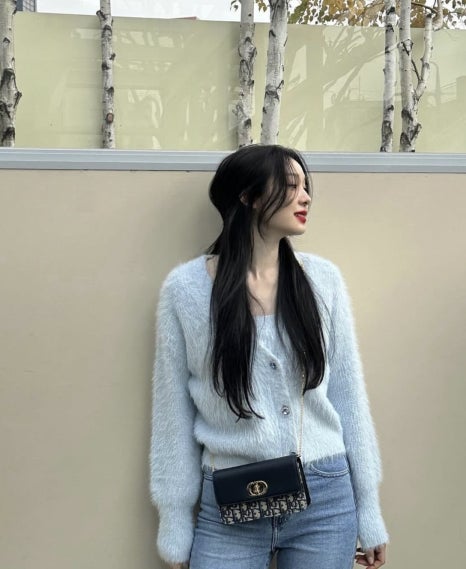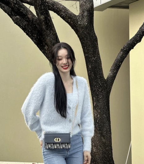 그녀의 가방은 디올의 ‘Miss Caro 체인 파우치’입니다. 해당 제품은 2025크루즈 시즌에 새롭게 내놓은 제품으로 비교적 컴팩트한 크기의 백이죠. 이는 블루 디올 오블리크 자카드 소재와 송아지 가죽으로 제작되었는데요, 화려하면서도 절제미 있는 세련된 디자인의 제품입니다. 중앙의 앤틱 골드 CD 잠금장치와 가방에 달린 체인 스트랩은 디테일은 해당 백의 고급스러운 포인트가 되어주고 있네요. 부담스럽지 않은 크기와 디자인으로 다양한 룩에 매치할 수 있어 코디 또한 어렵지 않을 것으로 보이죠.
