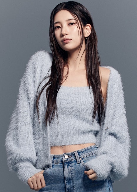 그녀의 상의 정보는 나시와 가디건의 세트 제품으로 ‘여성 블링버튼 날개사 긴팔 가디건_LIGHT BLUE’ 와 ‘여성 블링 포인트 퍼 스웨터 슬리브리스_LIGHT BLUE’ 입니다. 게스의 간판인 수지가 화보에서 착용하여 품절 대란이 난 제품이기도 하죠.
