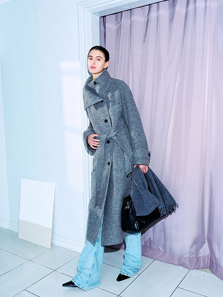 해당 코트는 헤어리한 텍스처가 돋보이는 소재로 비교적 러프한 느낌을 살린 것을 알 수 있습니다. 동일 소재의 벨트로 다양한 활용이 가능하기도 하죠. 또한 와이드한 숄카라 디자인 덕분에 하이넥으로 착용하거나 카라를 접어 자연스러운 느낌을 내는 등의 연출이 가능합니다. 다양한 무드의 룩과도 어울려 손이 많이 갈 듯한 아이템이네요.