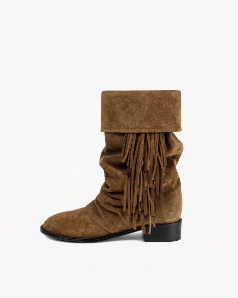 걸을 때마다 찰랑거리는 프린즈 디테일이 포인트인 롱부츠입니다. 소가죽 100% 스프리트 스웨이드를 사용해서 탄탄하면서도 자연스러운 실루엣을 갖춰서, 부츠가 흘러내릴수록 멋스러운 핏이 나며 빈티지 무드가 더욱 느껴지는 제품이에요. 보헤미안 스타일이나 빈티지 감성을 좋아하시는 분들이라면 취향저격 할 수 있는 부츠라고 생각합니다!