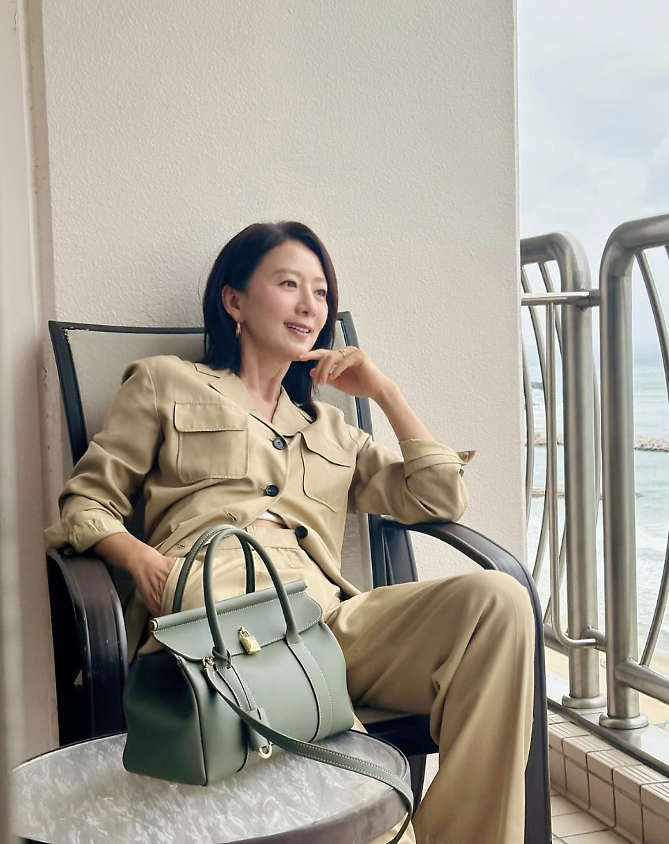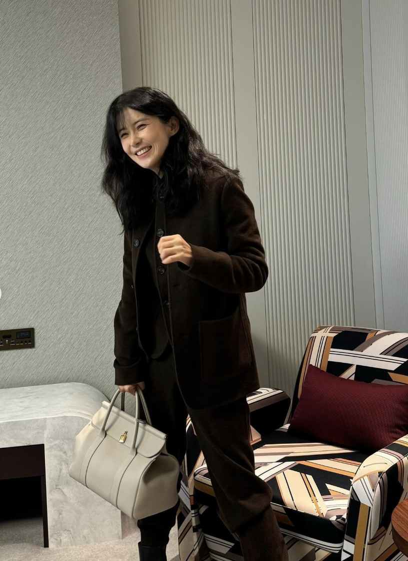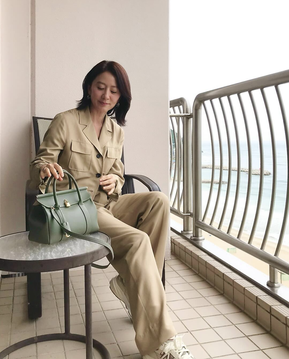 컬러 매칭이 진짜 나이스...! 김희애는 베이지 컬러의 셋업에 로로피아나 룸백을 매치해 세련되면서도 편안한 리조트 룩을 연출했습니다. 자연스럽게 흐르는 실루엣과 가방의 고급스러운 가죽 질감이 완벽하게 어우러졌죠.