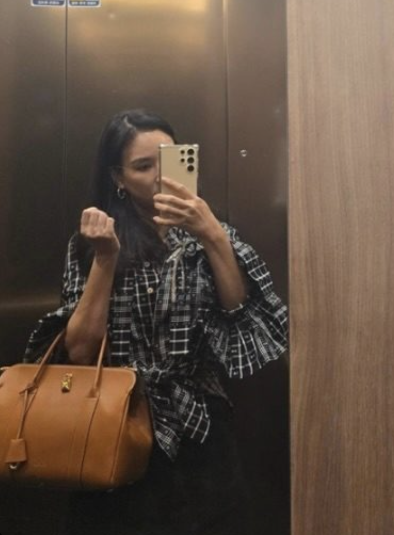 고소영 역시 데일리 룩에 룸백을 활용했는데요. 체크 패턴 블라우스와 블랙 하의를 매치한 클래식한 스타일링에 브라운 컬러 룸백을 들어 더욱 고급스러운 분위기를 완성했습니다.