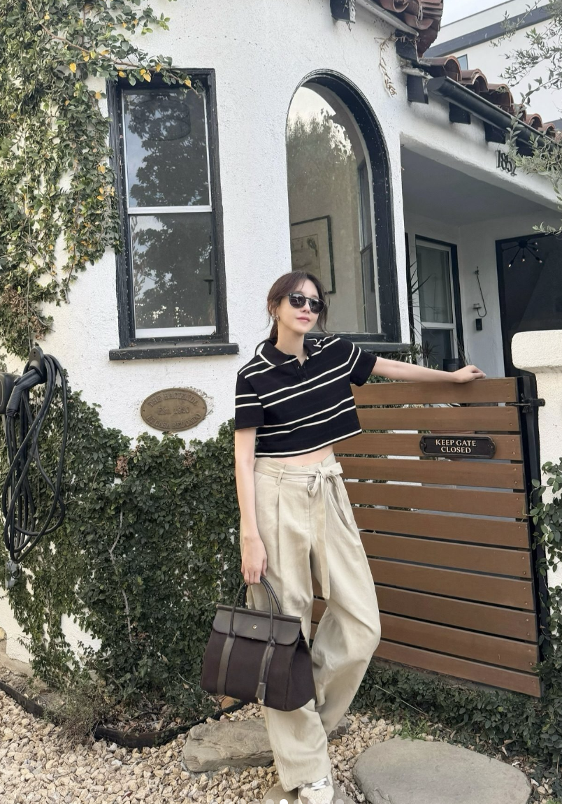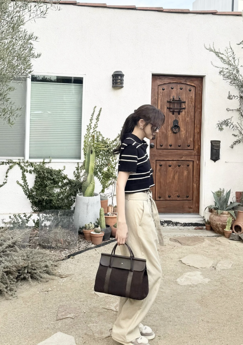 이지아는 한층 더 캐주얼한 분위기로 연출했습니다. 스트라이프 톱과 와이드 팬츠에 브라운 톤의 캔버스 룸백을 매치해 보다 편안하면서도 감각적인 스타일을 완성했죠.