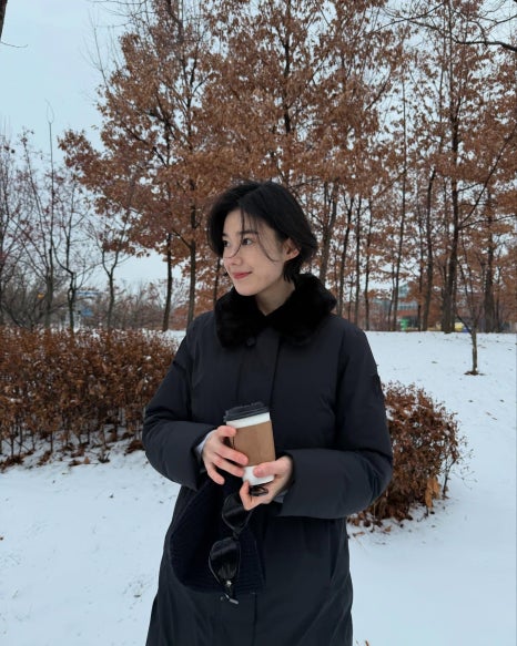 그레이와 블랙 그 중간 즈음의 컬러로 출시된 노비스 에밀리아 롱패딩은 새하얀 눈 위에서 정은채의 하얀 피부를 더욱 돋보이게 해주었는데요. 무릎 아래까지 내려오는 기장의 다운 코트로 추운 겨울철에 입기 좋습니다. 몸에 자연스럽게 핏 되는 실루엣이기도 하지만 벨트가 함께 있어 한층 여성스러운 무드를 연출할 수 있답니다.