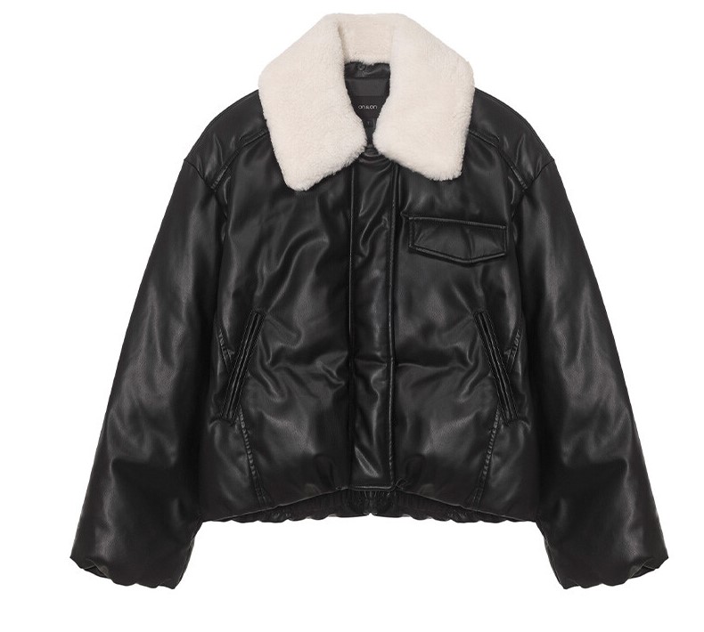 또한 적당한 세미 크롭 기장감으로 데일리 패딩으로 활용하기도 좋습니다.레더 패딩의 소매와 몸판 밑단은 속밴딩 처리하여 볼륨을 살렸습니다. 퍼카라패딩에는 화이트 컬러 덤블퍼카라가 있는데요.