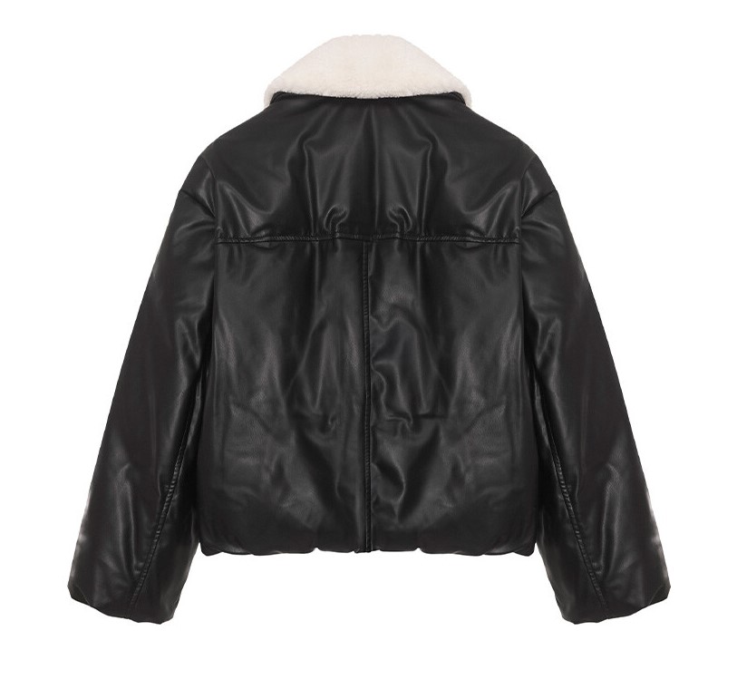 또한 적당한 세미 크롭 기장감으로 데일리 패딩으로 활용하기도 좋습니다.레더 패딩의 소매와 몸판 밑단은 속밴딩 처리하여 볼륨을 살렸습니다. 퍼카라패딩에는 화이트 컬러 덤블퍼카라가 있는데요.