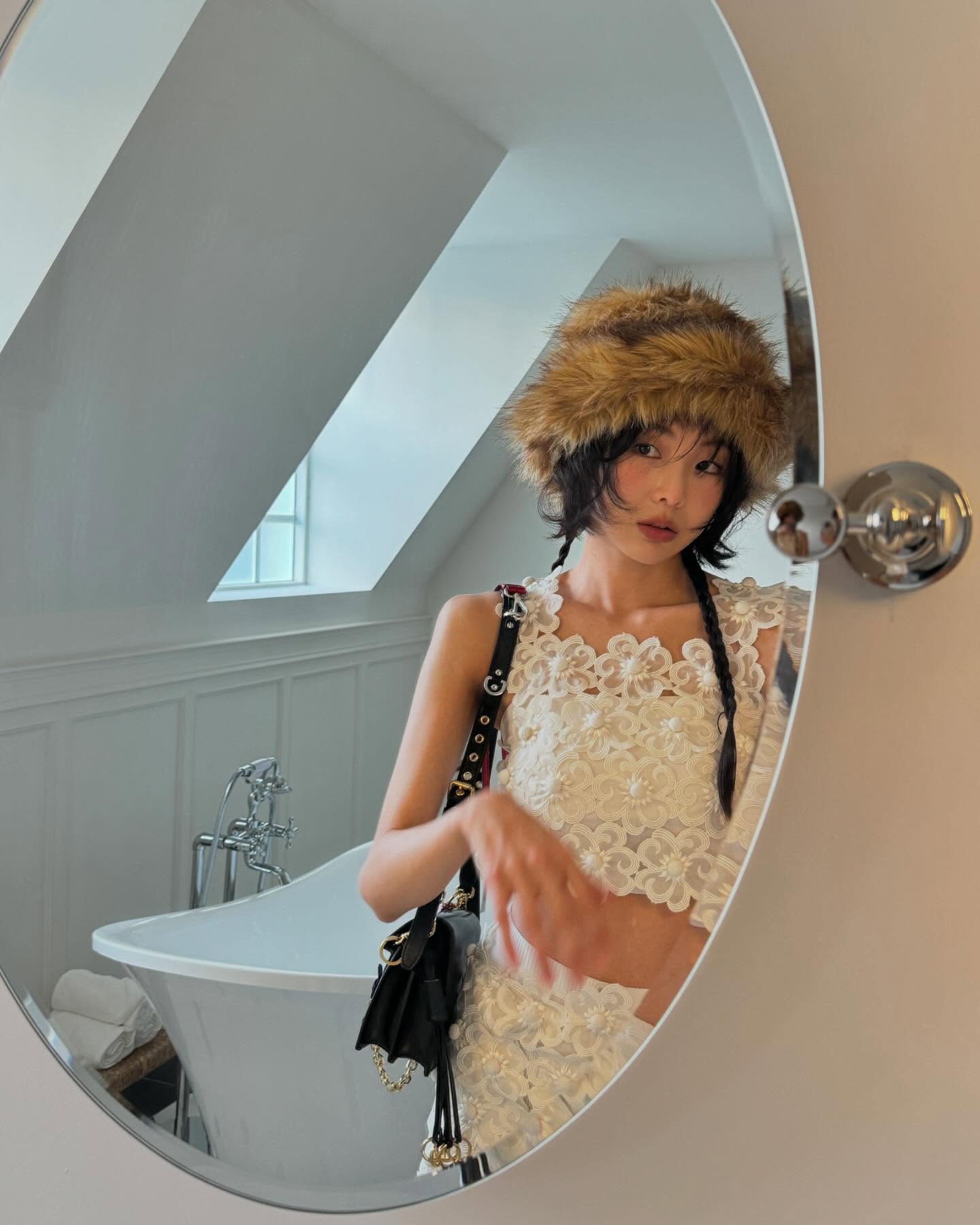 드뮤어 장인으로 불리는 배우 금새록 또한 프라다의 신상 백을 착용해 스타일리시한 모먼트를 선보였습니다. 금새록은 플라워 모양의 펀칭 디테일이 돋보이는 슬림한 화이트 룩에 털 모자를 포인트를 준 뒤 프라다의 신상 백을 매치했습니다. 평소 꾸안꾸 사복을 선호하는 그녀답게 너무 과하지 않고 멋스럽게 소화한 그녀의 센스가 돋보이는데요!