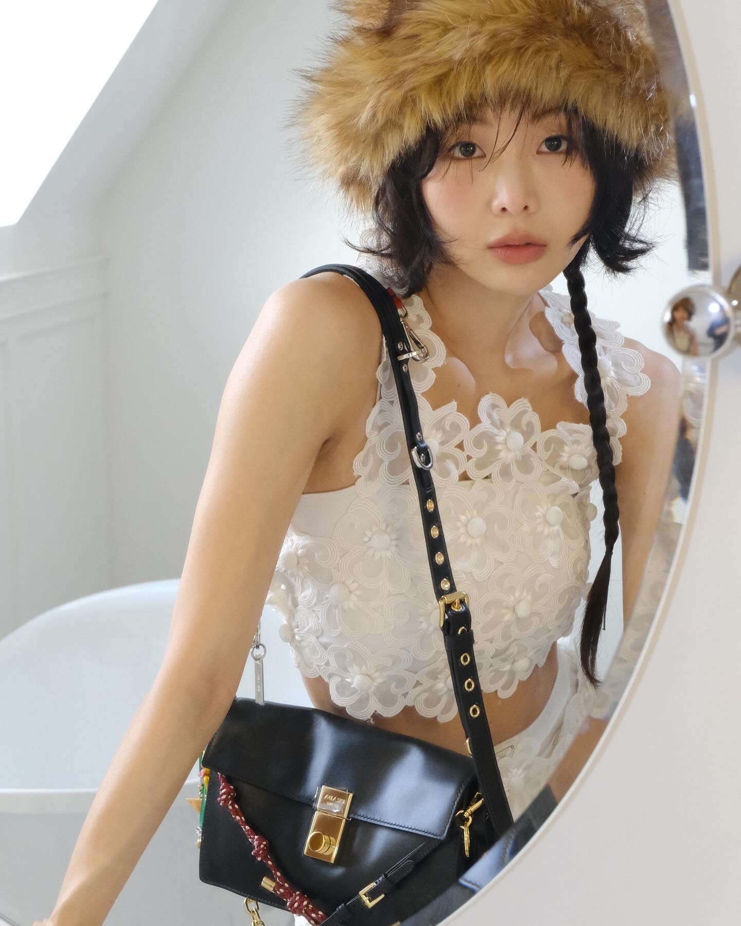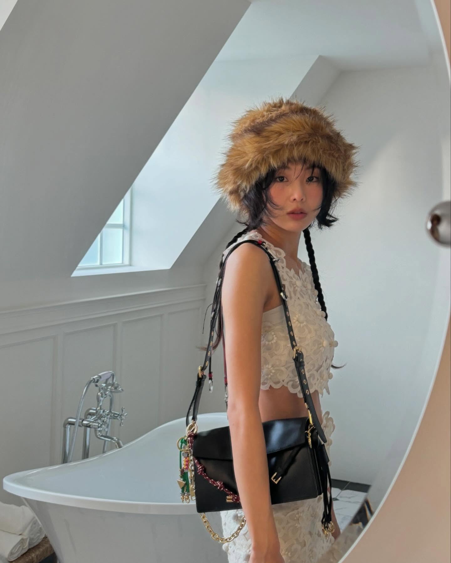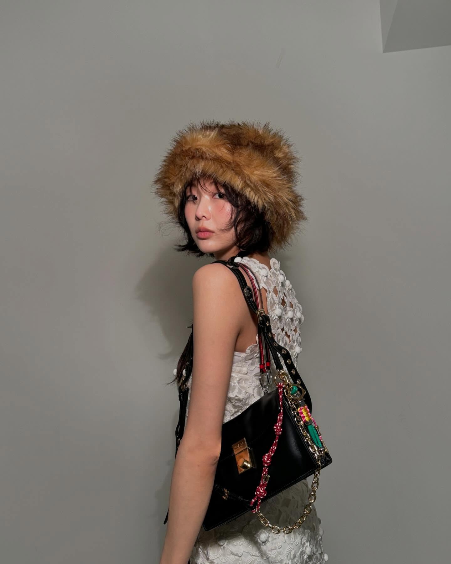 드뮤어 장인으로 불리는 배우 금새록 또한 프라다의 신상 백을 착용해 스타일리시한 모먼트를 선보였습니다. 금새록은 플라워 모양의 펀칭 디테일이 돋보이는 슬림한 화이트 룩에 털 모자를 포인트를 준 뒤 프라다의 신상 백을 매치했습니다. 평소 꾸안꾸 사복을 선호하는 그녀답게 너무 과하지 않고 멋스럽게 소화한 그녀의 센스가 돋보이는데요!