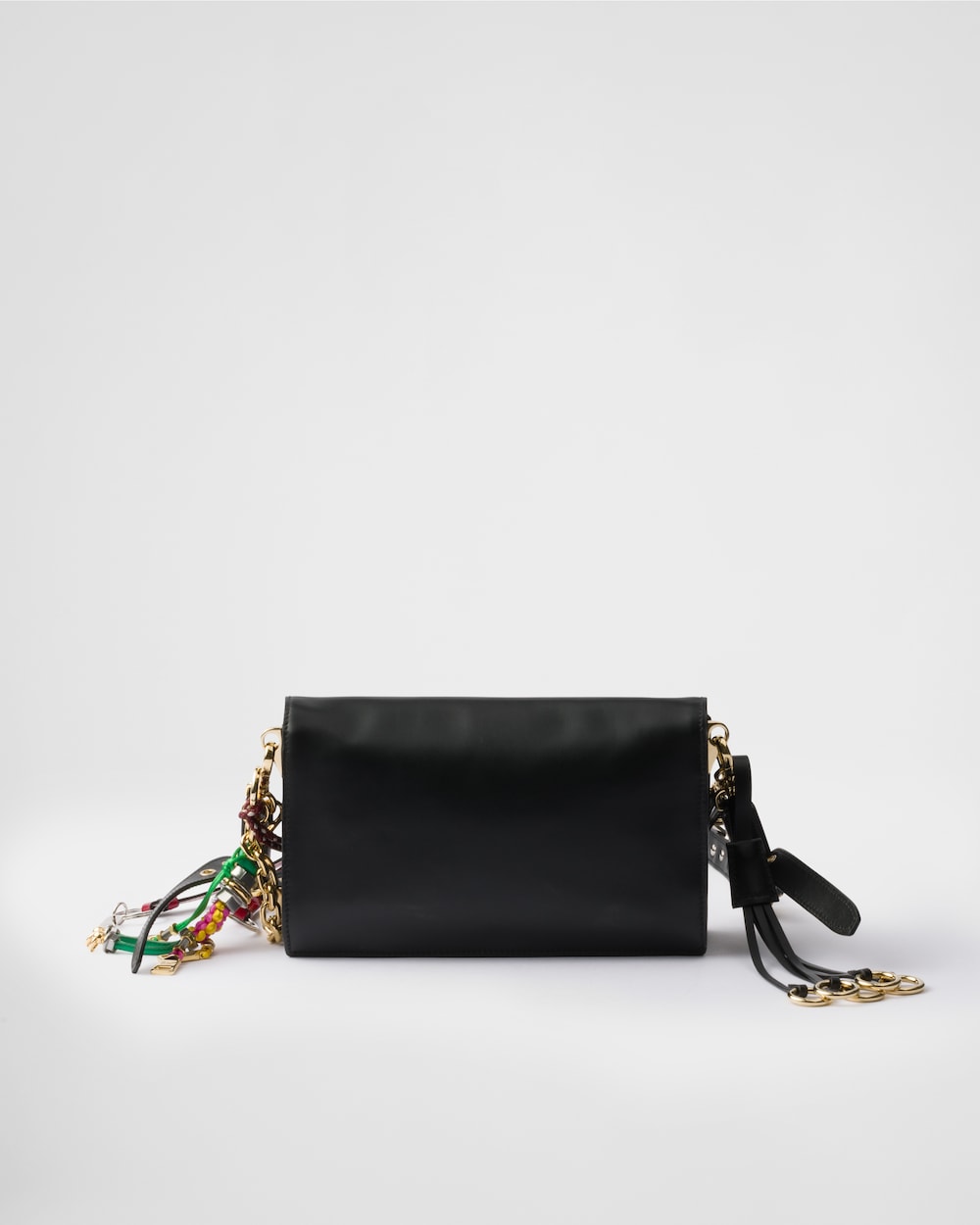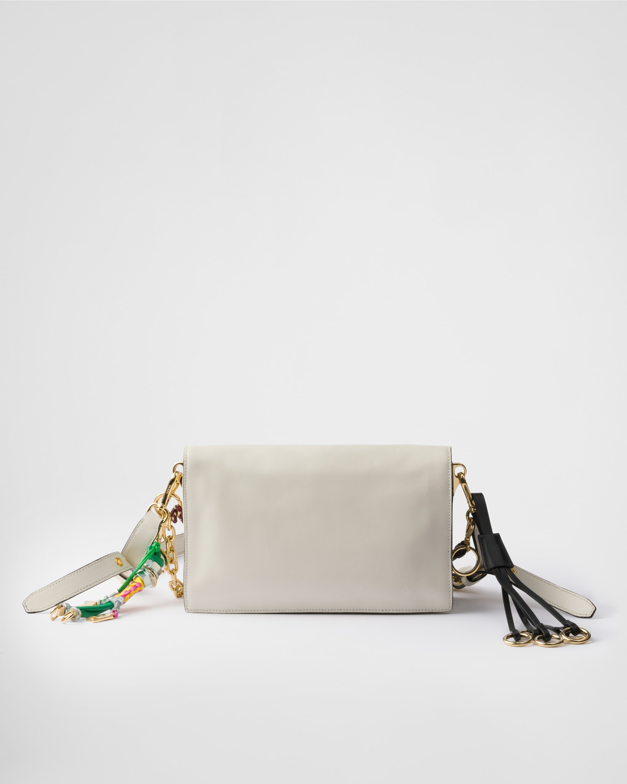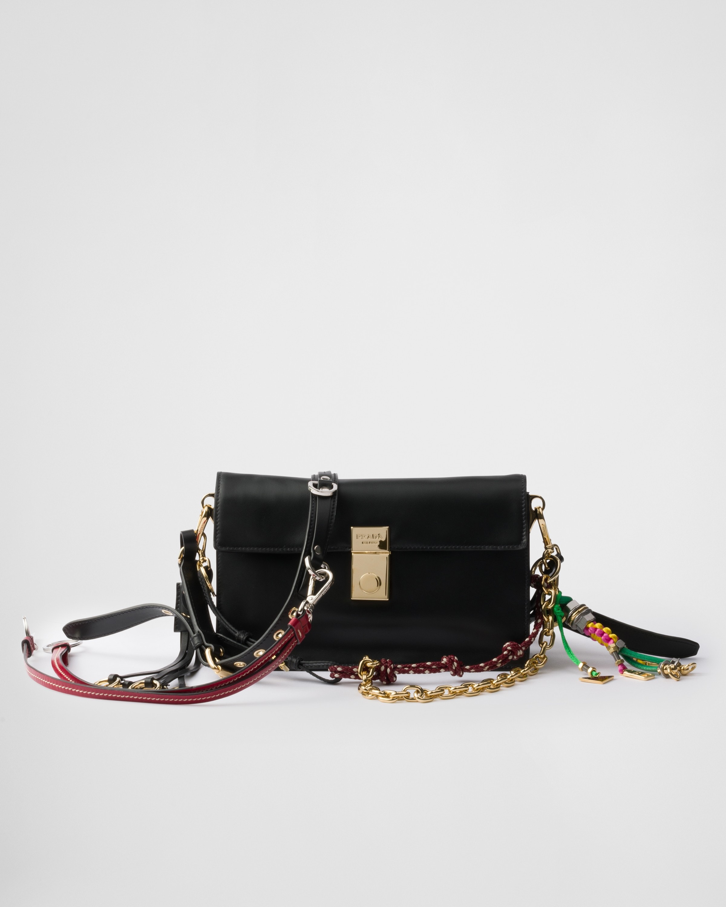 프라다 소프트 사운드 백은 간단한 지갑이나 소지품, 아이폰 등이 충분히 들어갈 정도의 크기이며 내부에는 두 개의 수납공간과 두 개의 포켓으로 구성되어 있습니다. 부드러운 가죽 소재로 이루어져 골드 컬러의 메탈 하드웨어와 참들이 돋보이는 소프트 사운드 백은 일상 속 데님룩과 매치하면 캐주얼한 무드를, 금새록처럼 디테일이 가미된 파티 룩과 함께 매치하면 더욱 화려함을 배가해줄 것 같네요!
