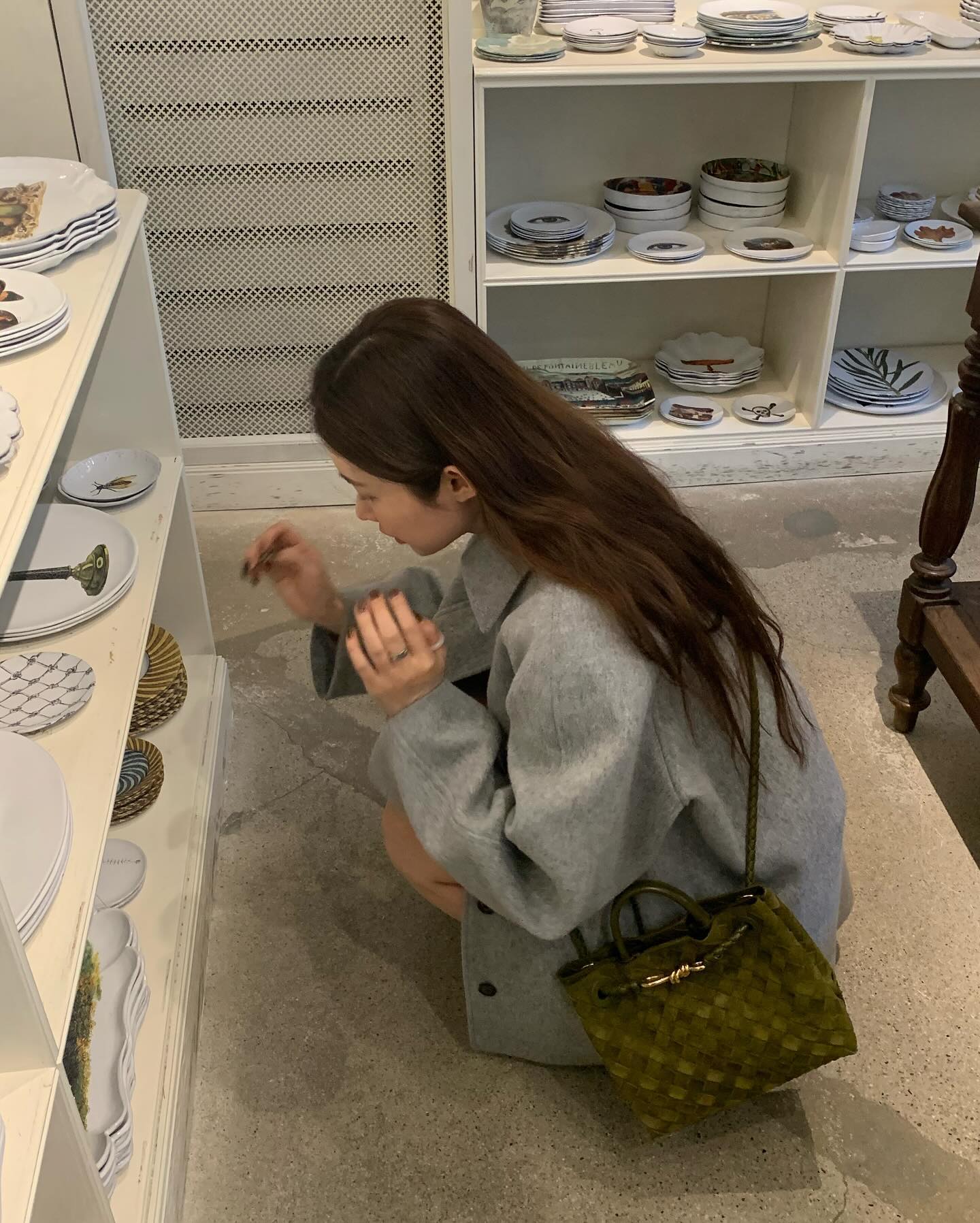 늘, 언제나, 어디서나 스타일리시한 패션 센스를 보여주는 차정원은 이번에도 멋스러운 코트 룩을 선보였습니다. 발목까지 내려오는 맥시한 롱 코트가 아닌 하프 기장의 반코트로 말이죠. 차정원은 그린 컬러 니트에 플리츠 스커트와 함께 그레이 코트를 매치했습니다. 여기 양말 컬러를 딥 그레이로 맞추는 센스도 놓치지 않았는데요.