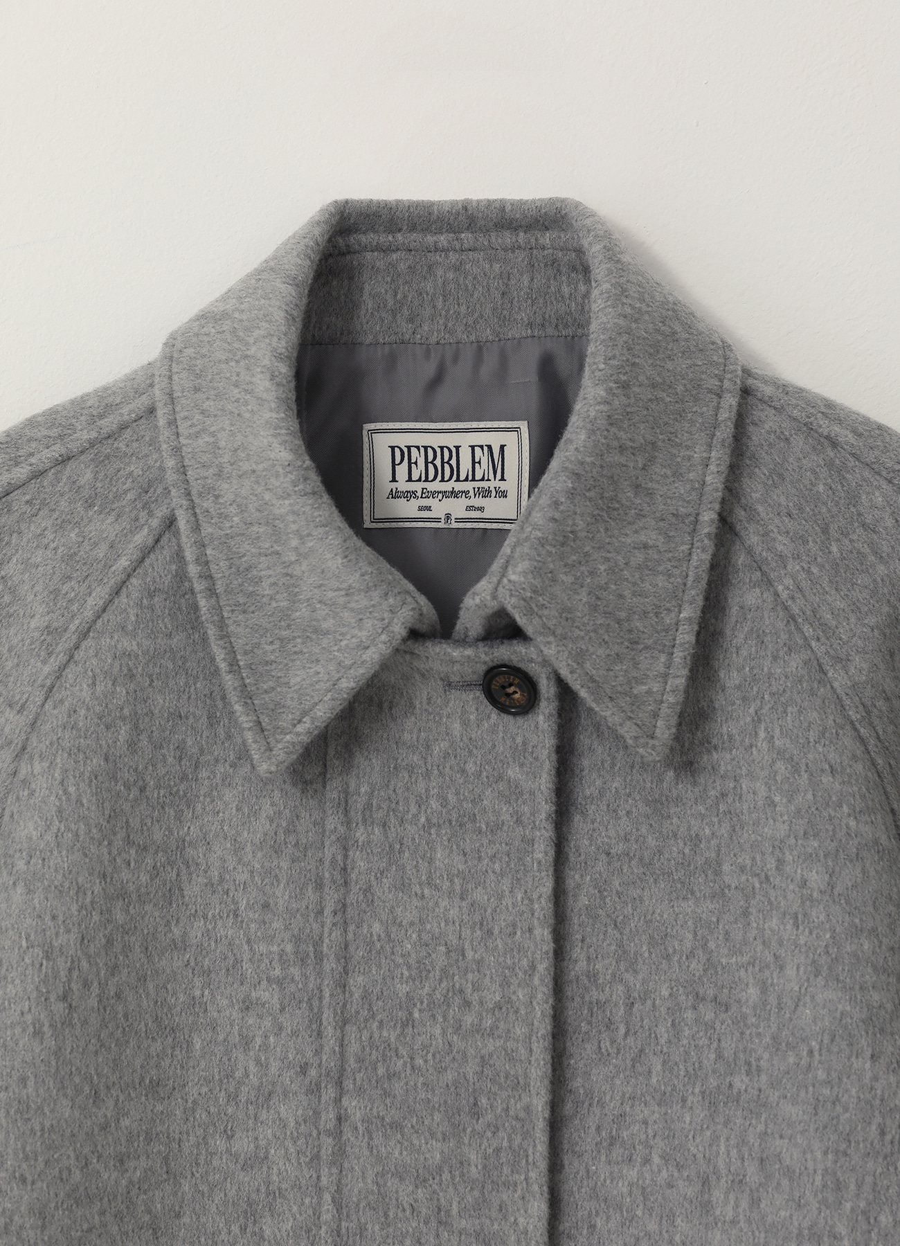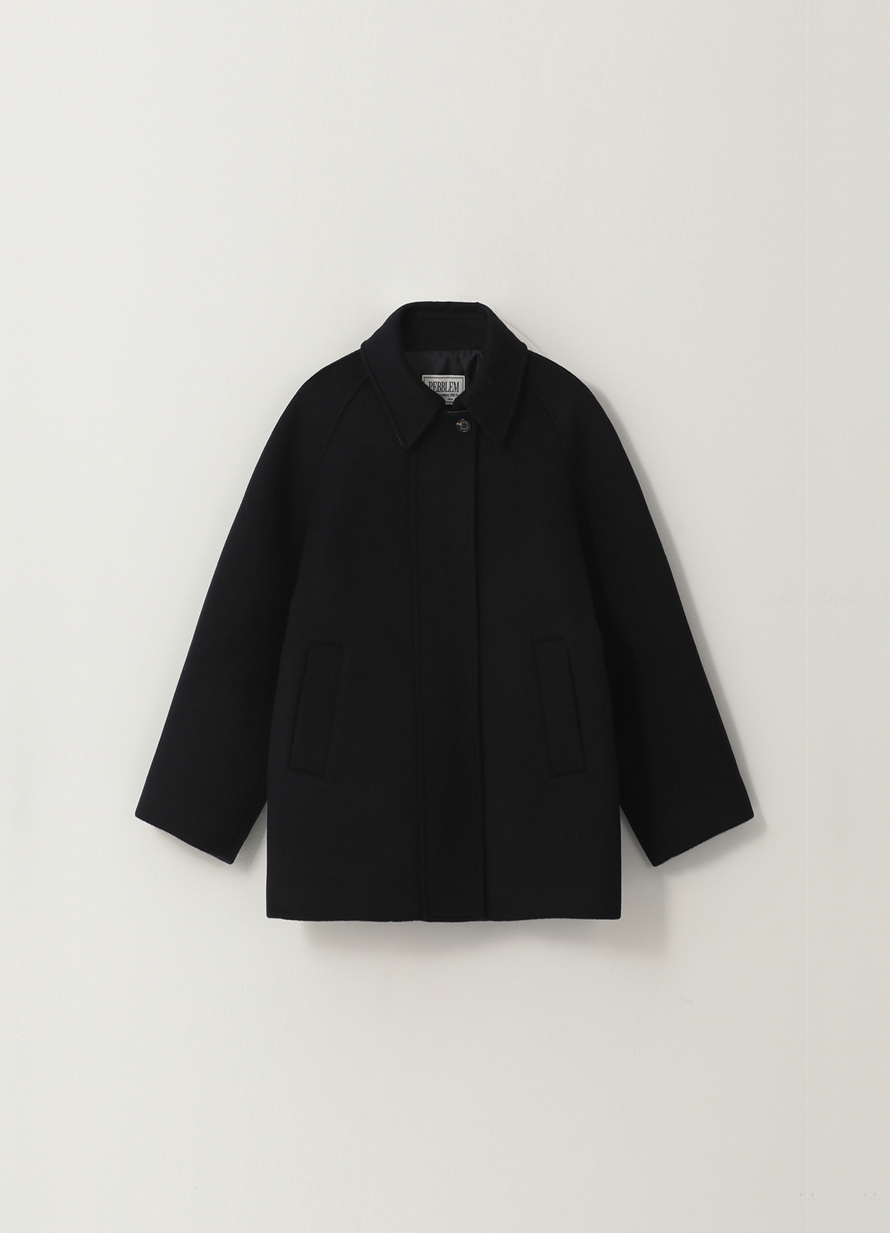 안감있음/비침없음/신축성없음 울 혼방 소재를 사용해 하이퀄리티로 제작된 싱글 하프 코트 울 90% 함유로 보온성과 내구성을 높여줌 입체감을 살린 볼륨있는 래글런 소매 디자인이 포인트 첫
