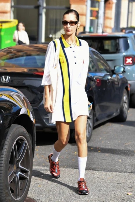 벨라 하디드는 원피스 형태 폴로 셔츠와 긴 삭스 그리고 컬러 스니커즈를 함께 매치해 귀여운 코디를 완성했다. 폴로 셔츠 원피스는 스포티한 무드와 함께 실제로 활동성이 높아 다양한 상황에서 유용하게 활용할 수 있는 아이템 중 하나다. 심플하지만 매력적인 폴로 셔츠 룩을 원한다면 벨라 하디드처럼 폴로 셔츠 원피스를 선택해 보길.