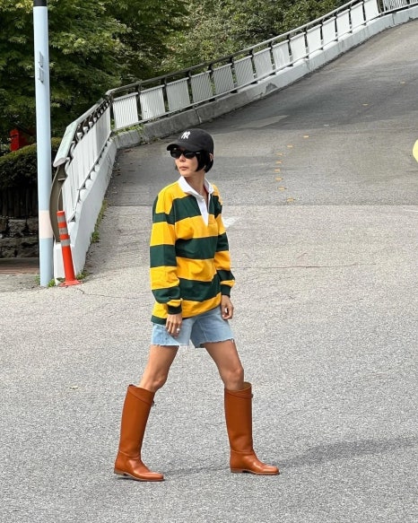 반면 인플루언서 김나영은 럭비 선수들의 유니폼이 떠오르는 스트라이프 폴로 셔츠를 선택했다. 옐로우와 그린이 조화로운 큼지막한 스트라이프 패턴이 돋보이는 오버핏 폴로 셔츠에 데님 쇼츠를 매치하고 브라운 롱부츠로 마무리했다. 이렇듯 오버핏 폴로 셔츠는 자유로우면서 경쾌한 느낌을 연출하기 제격이다.