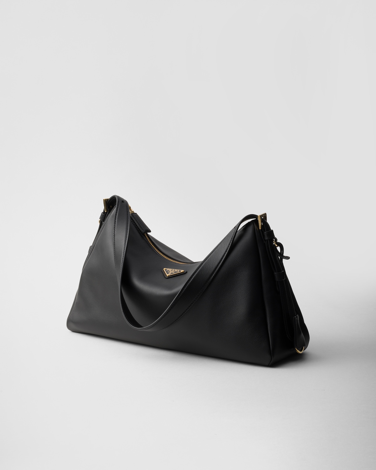 프라다 신상 가방 중 하나인 에메 숄더백은 라지 사이즈임에도 불구하고 과한 느낌이 없어 부담 없이 들기 좋은 편입니다. 가방과 함께 제공되는 키링 또한 탈부착 가능하니, 기호에 따라 활용하면 좋을 것 같아요! 미디엄 사이즈는 높이 18, 폭 31 길이 10CM로 구성됐습니다. 참고로 두 사이즈 모두 전면에는 프라다의 시그너처 마크인 에나멜 메탈 트라이앵글 로고가 있어 포인트가 되어줍니다.