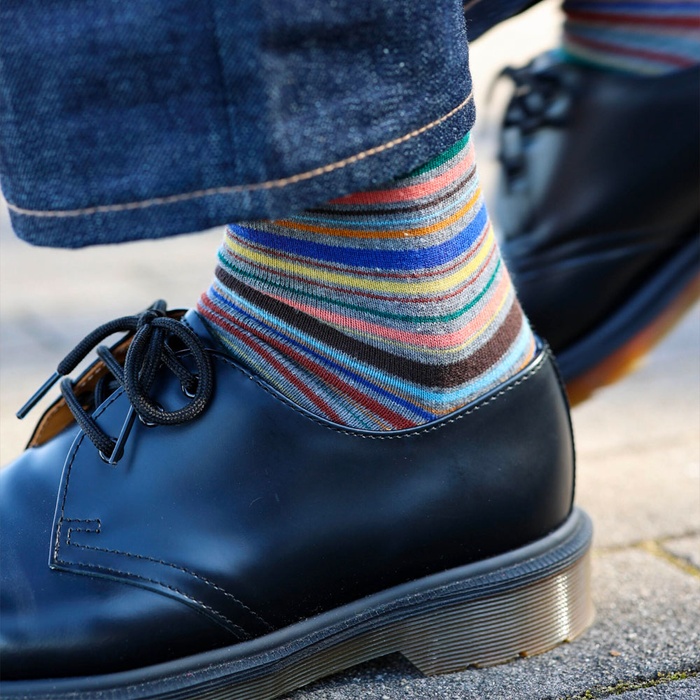 데님을 입고 다리를 꼬았을 때 살짝 보이는 부분이 이 줄무늬라면 아주 센스 있는 사람이라고 인식될 것 같네요. 요즘 같은 날씨, 블랙이나 브라운 코듀로이 팬츠를 입고 이런 양말을 신어주면 아주 귀엽겠쥬?