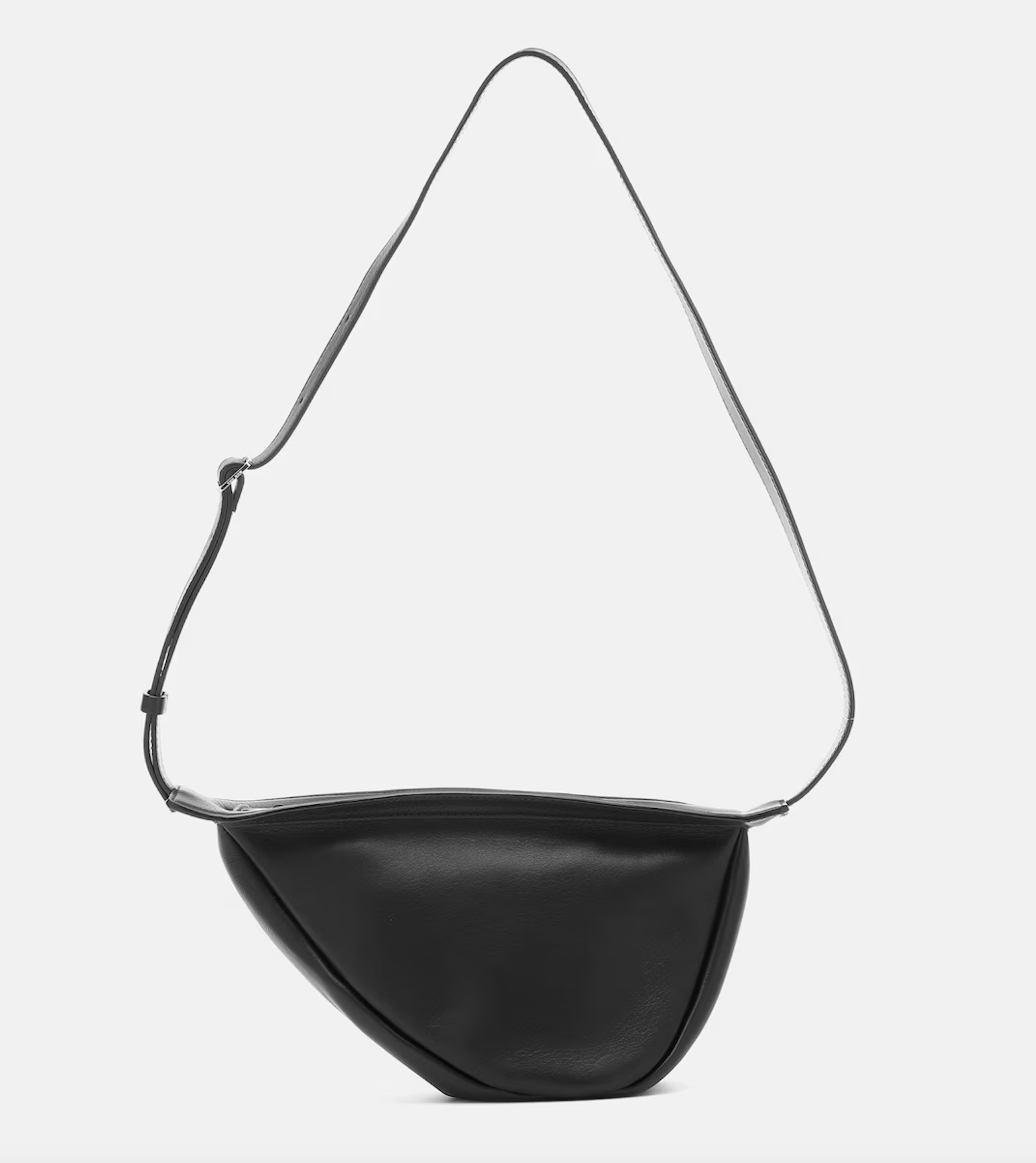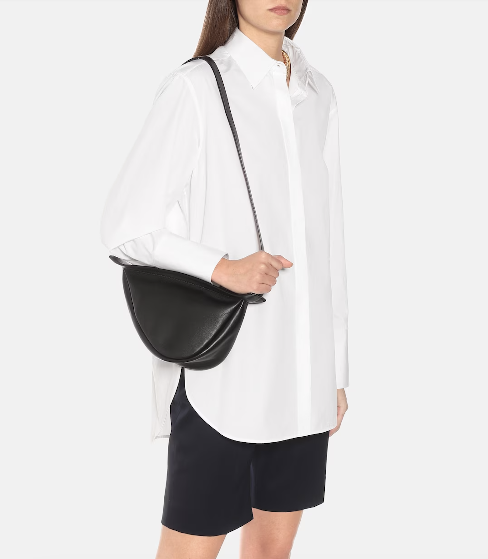 부드러운 블랙 컬러 가죽 소재의 심플한 디자인으로 선보이는 더 로우의 slouchy banana 스몰 크로스 백은 룩에 세련된 90년대 스타일의 포인트를 더할 수 있는 유니크하면서 깔끔한 아이템입니다. 소재와 안감 모두 가죽으로 되어있습니다. 한가인의 경우, 이 가방을 트래블 백으로 사용해 크로스로 착용해주었네요.