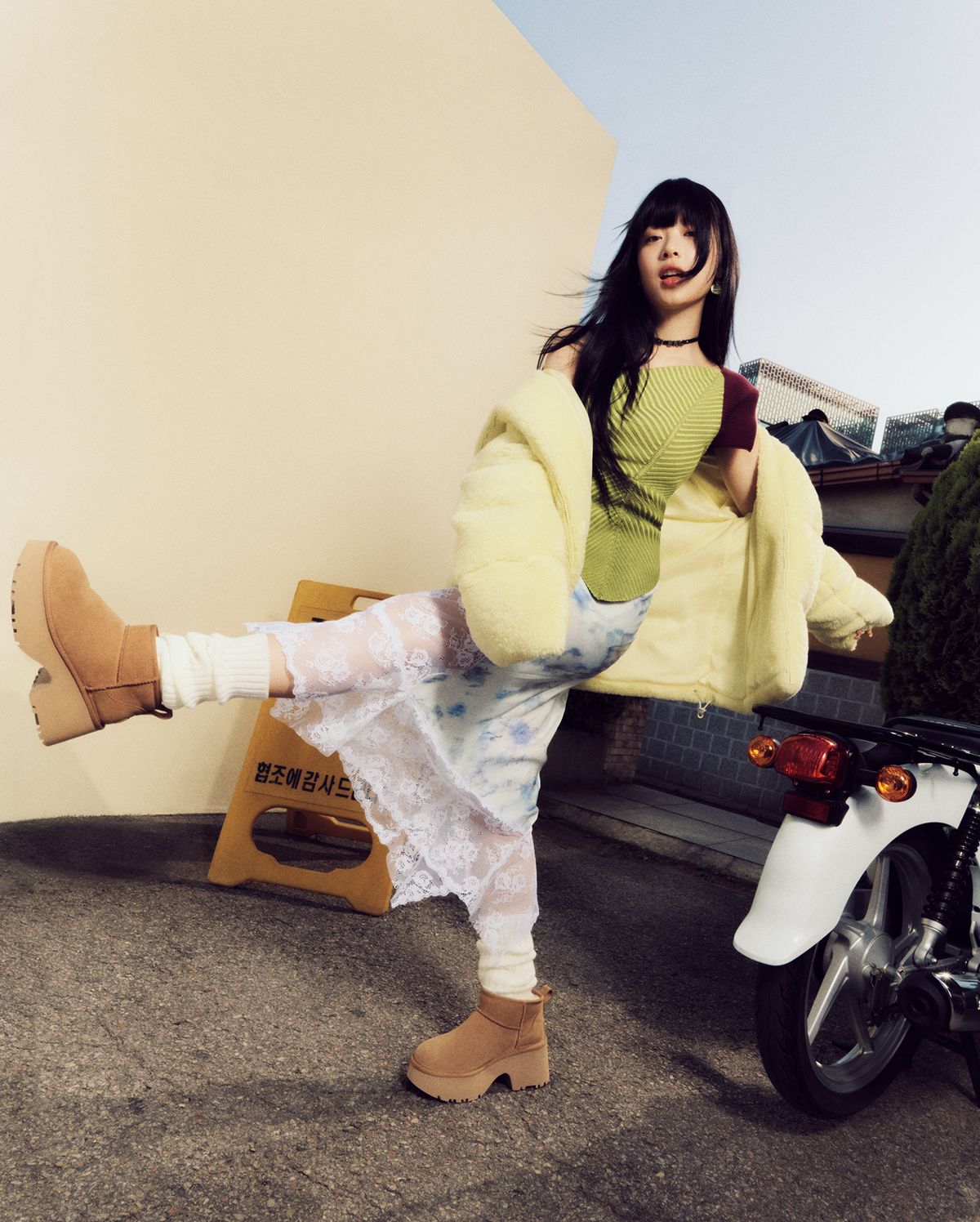 청키한 굽과 발목 라인을 따라 올라오는 높이로 힙한 분위기를 더해주고 있는 ‘크윈 심 뉴 하이츠 부츠(청키 지퍼 힐 부츠)’를 착용한 하니의 화보입니다. 해당 아이템은 하니가 홍보한 어그 제품으로 기존 클래식 제품을 힐로 변형하여 여성스러운 분위기를 더한 모습이죠. 두툼한 고무 밑창 및 지퍼로 잠가 슬림하게 올라오는 발목 부분은 더욱 예쁜 다리 라인을 연출해 주기도 합니다.