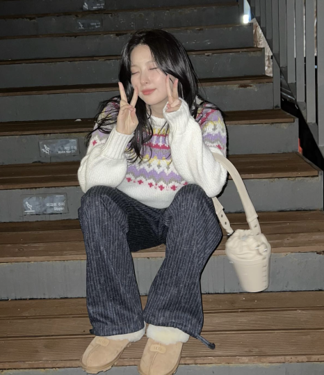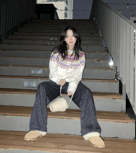 참고하기 좋은 사복 센스를 타고난 슬기는 어그의 코케트 슬리퍼 제품을 착용하였습니다. 해당 제품은 어그 클래식 다음으로 스테디셀러로 자리매김한 모델인데요, 특히 어그의 트레이드 컬러인 체스넛 색상의 제품이 길거리에 많이 보이기도 했어요.